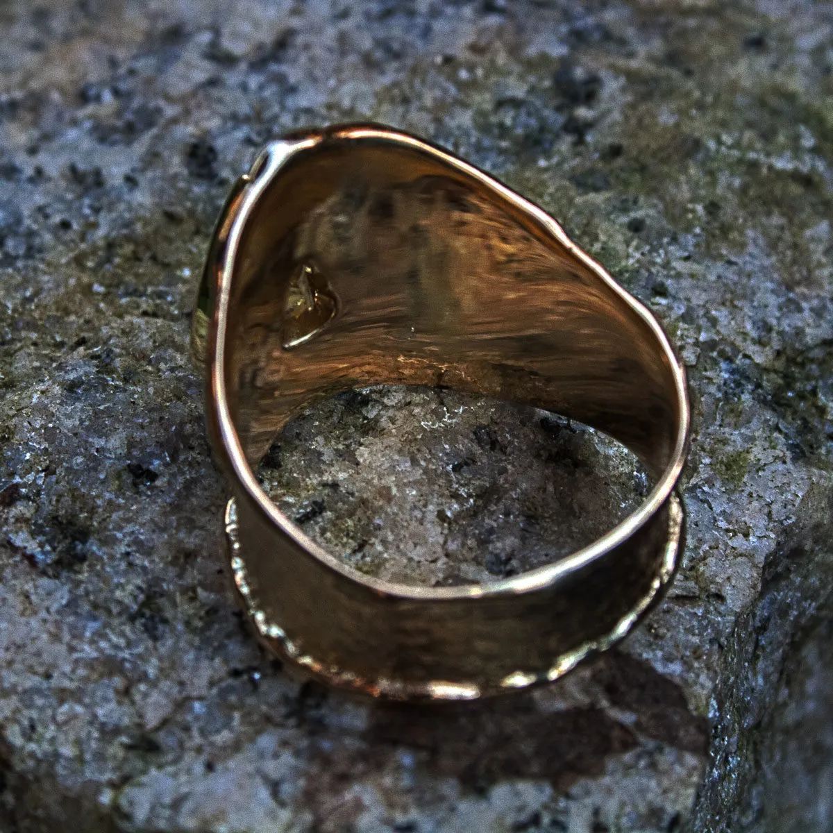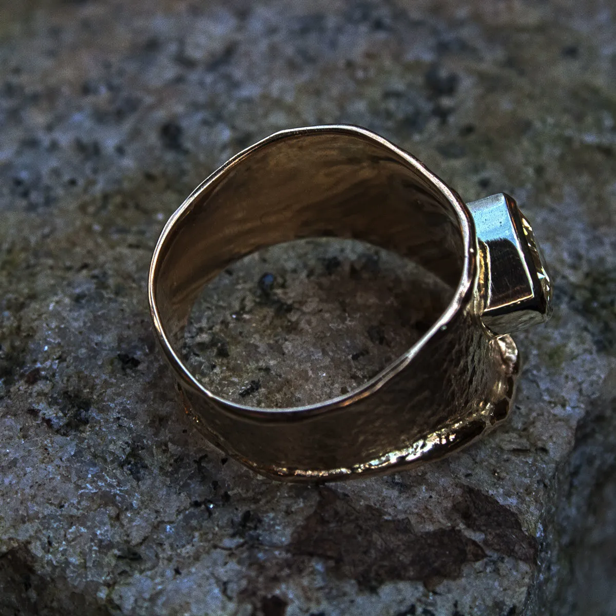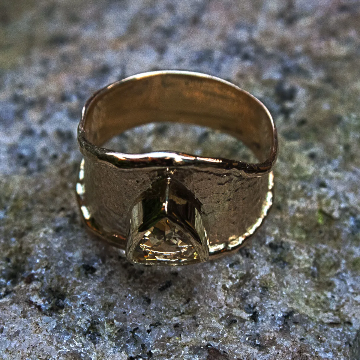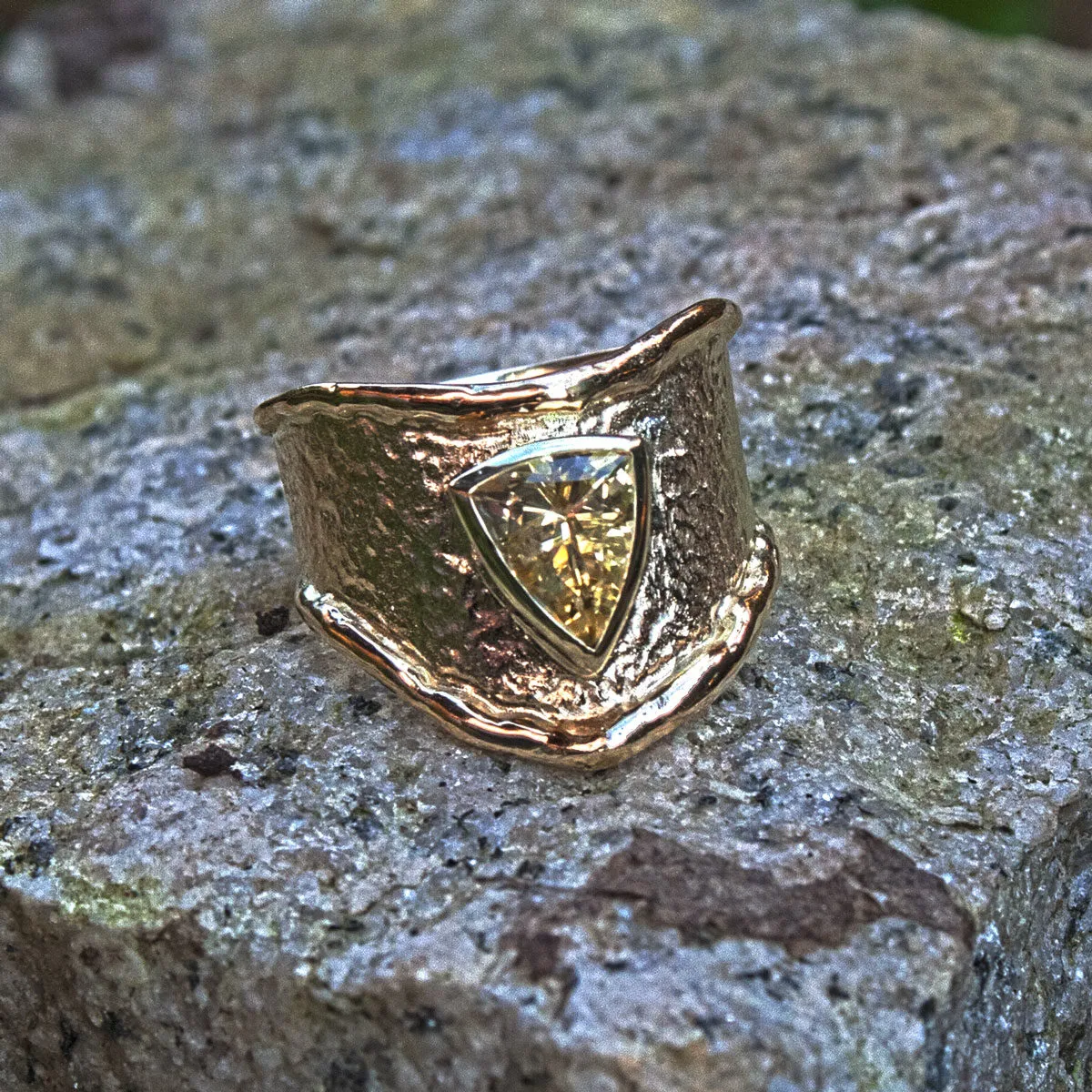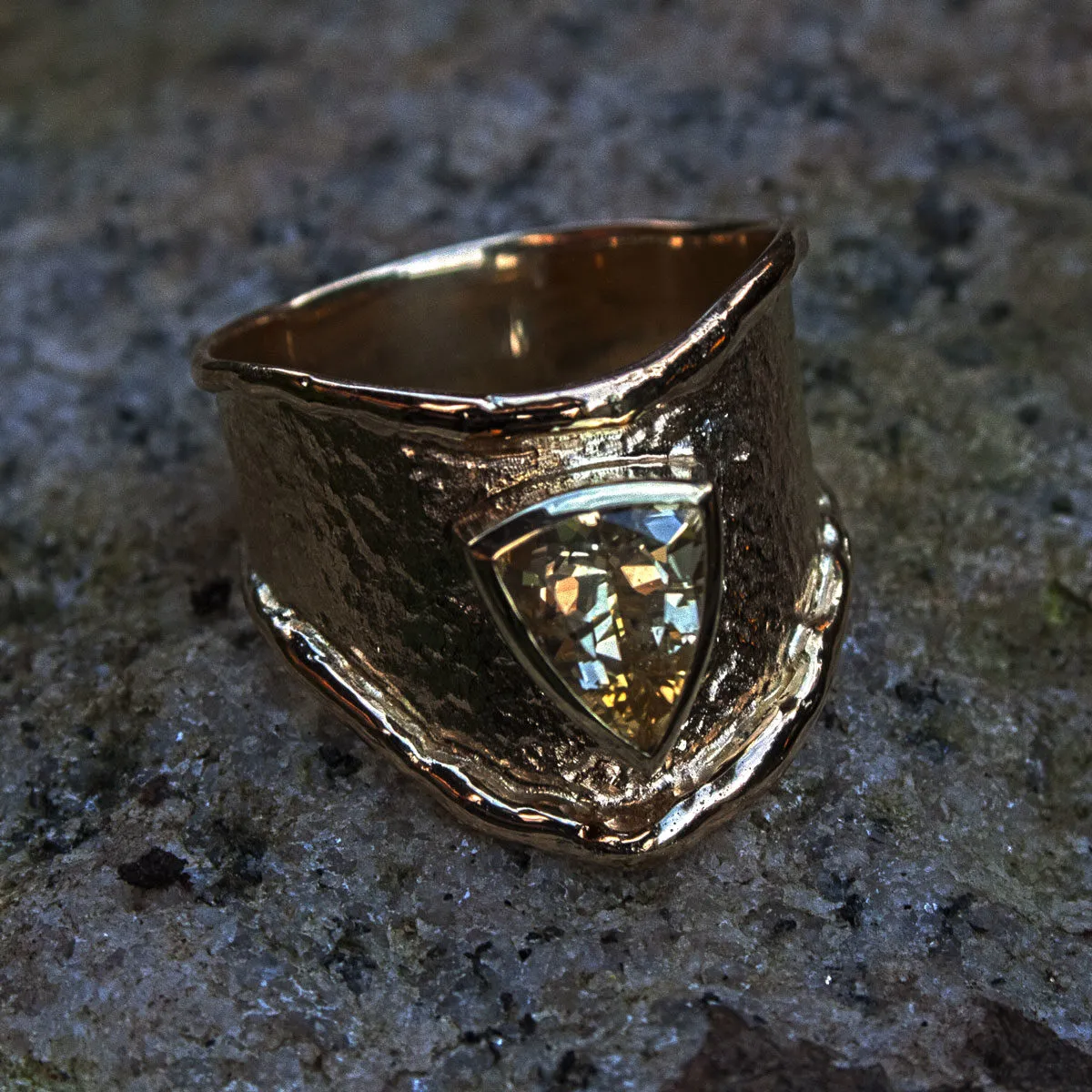 spitz zulaufender Gelbgoldring mit Schmorrand und aufgesetztem dreieckigen gelbem Saphir in Zargenfassung