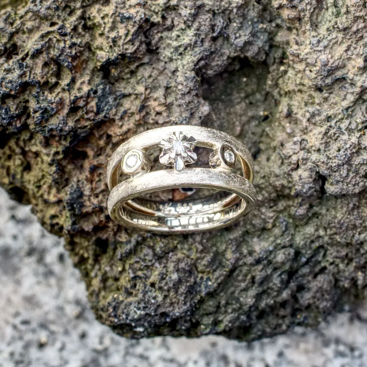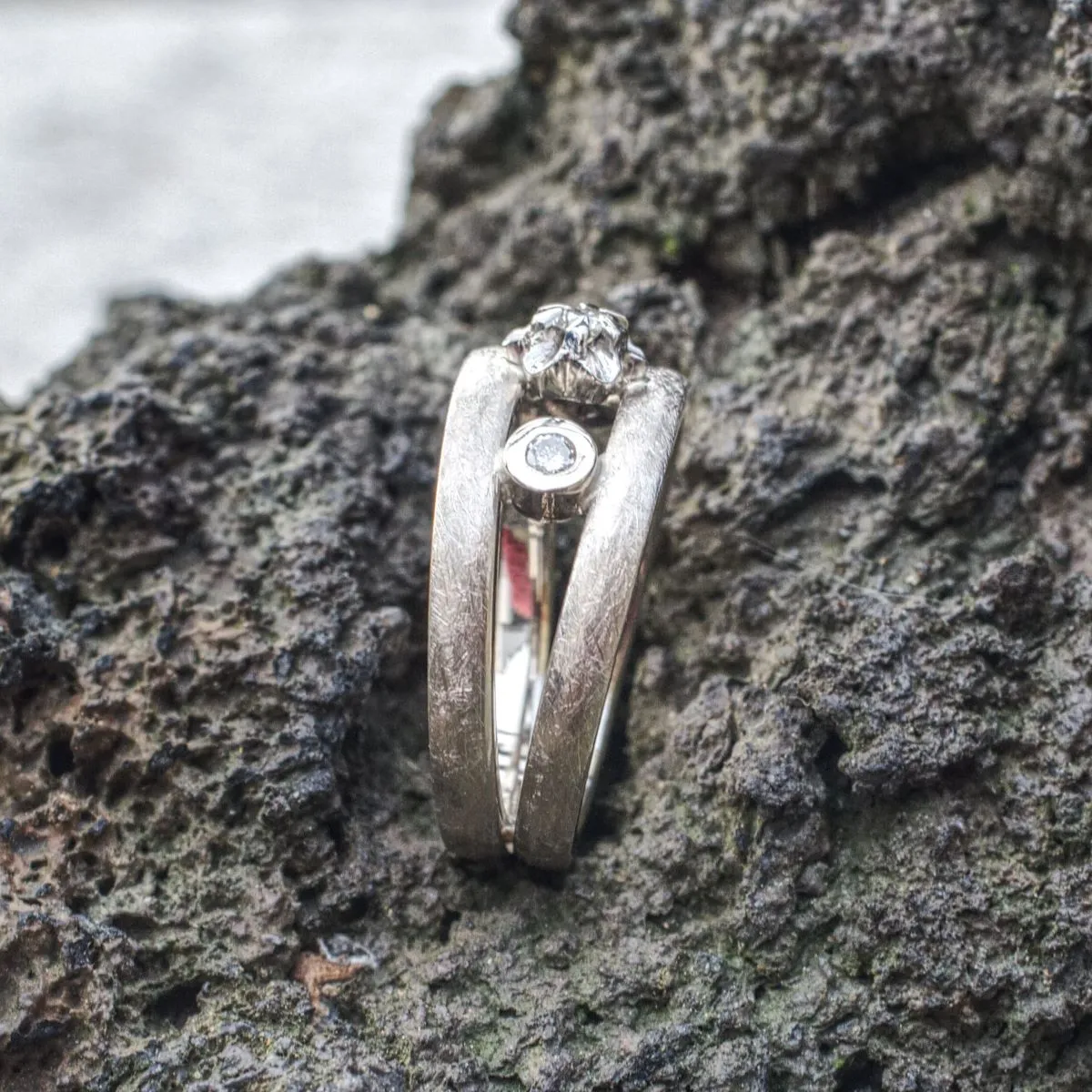Brillant in blumenförmiger Weißgold-Krappenfassung zwischen zwei Ringschienen, flankiert von zwei Brillanten