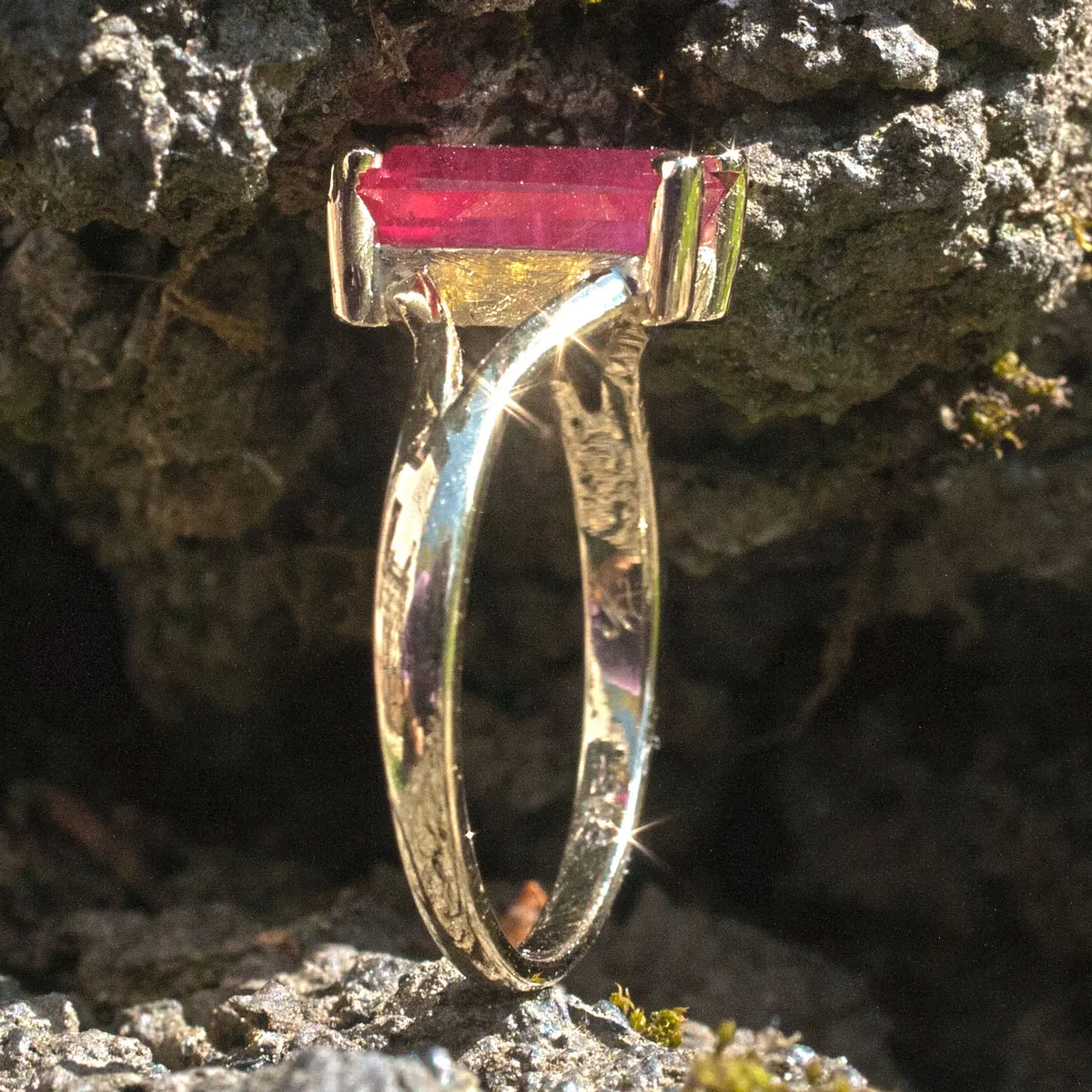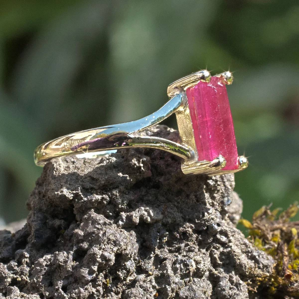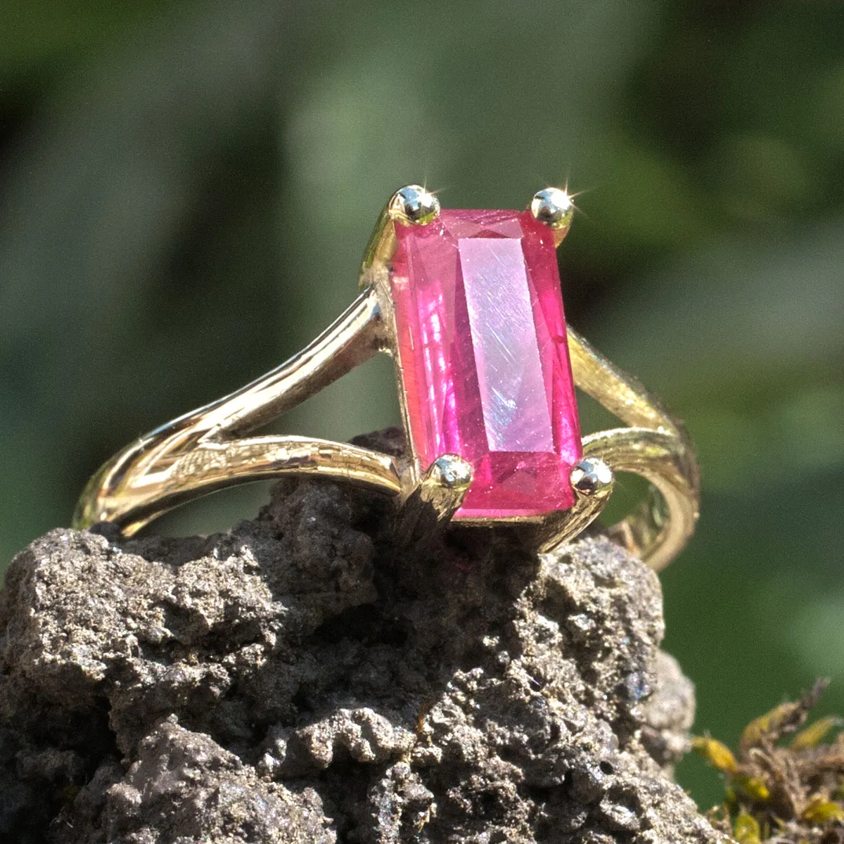 Goldring mit Rubinbaguette in Krappenfassung mit V-Förmig geteilter Schiene
