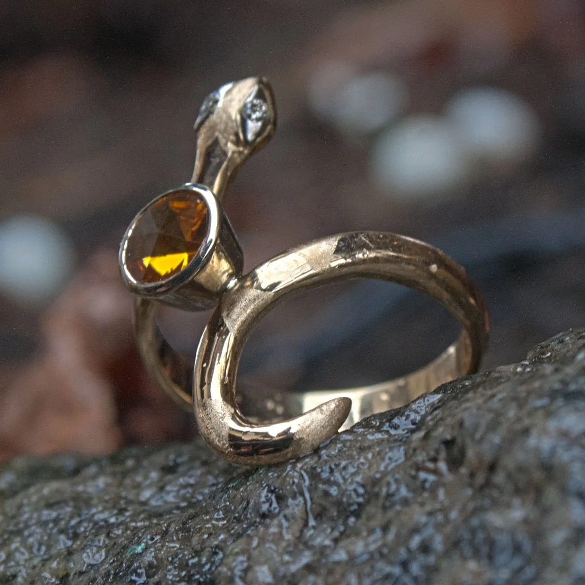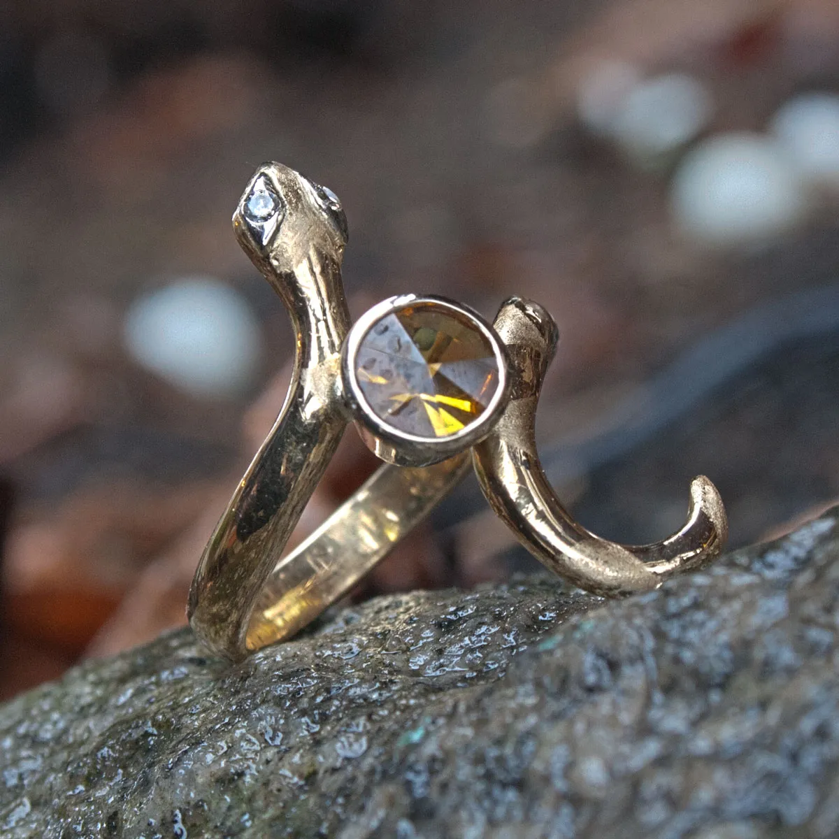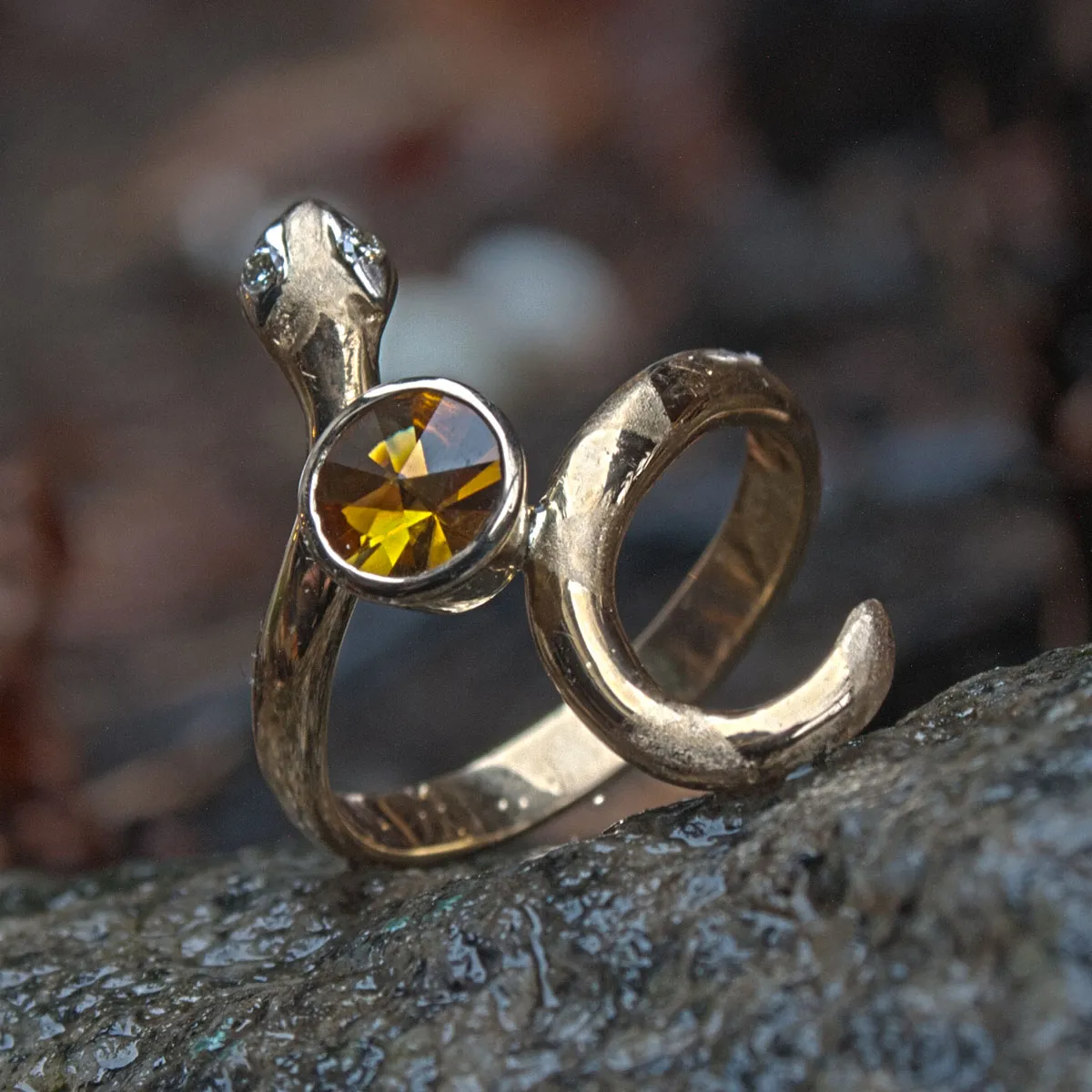 gelbgoldener Schlangenring mit Weißgoldbesatz und Brillantaugen, Citrin im spirit-sun-cut in weißgoldener Zargenfassung