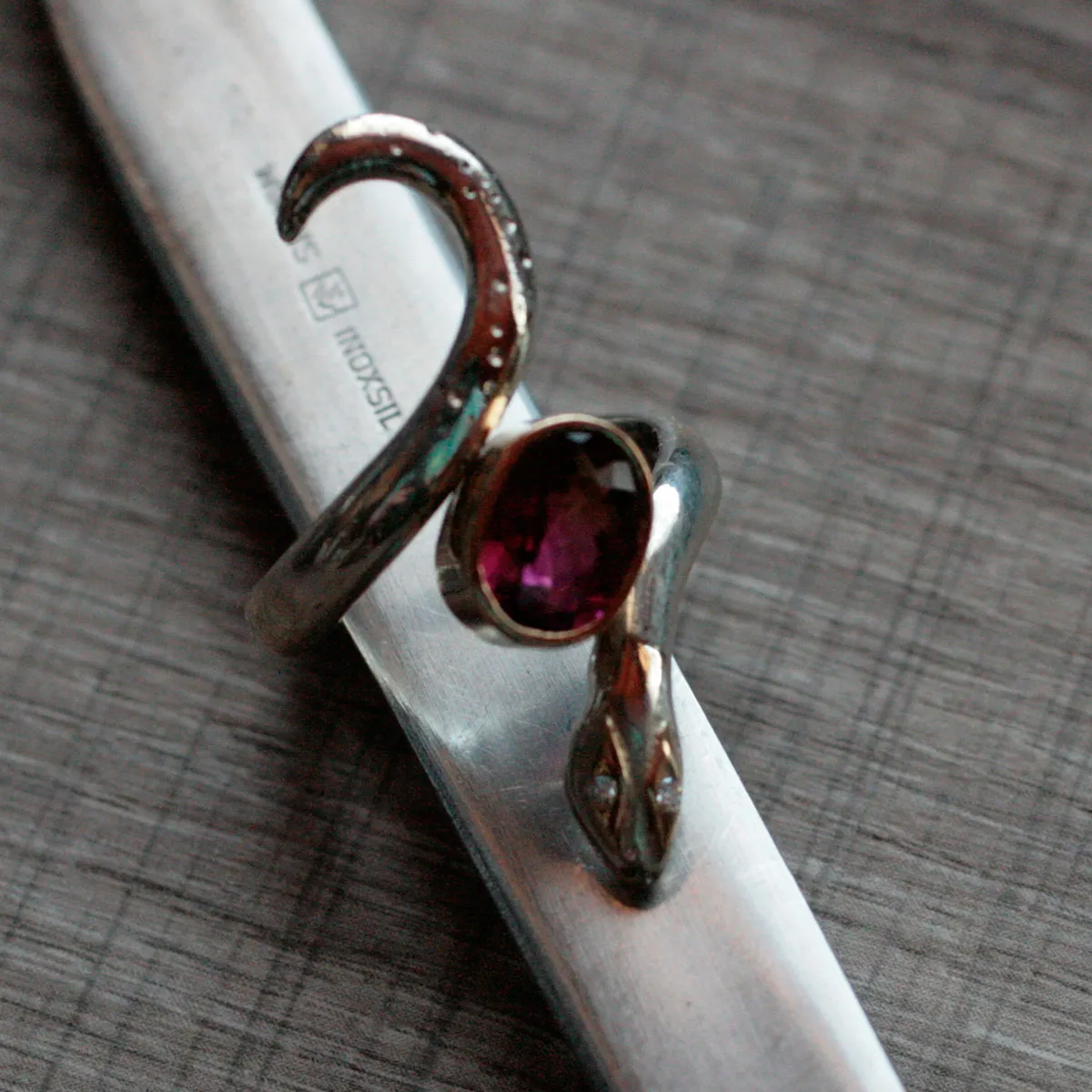 Schlangenring Silber mit Goldbesatz, Brillantaugen und rotem Turmalin