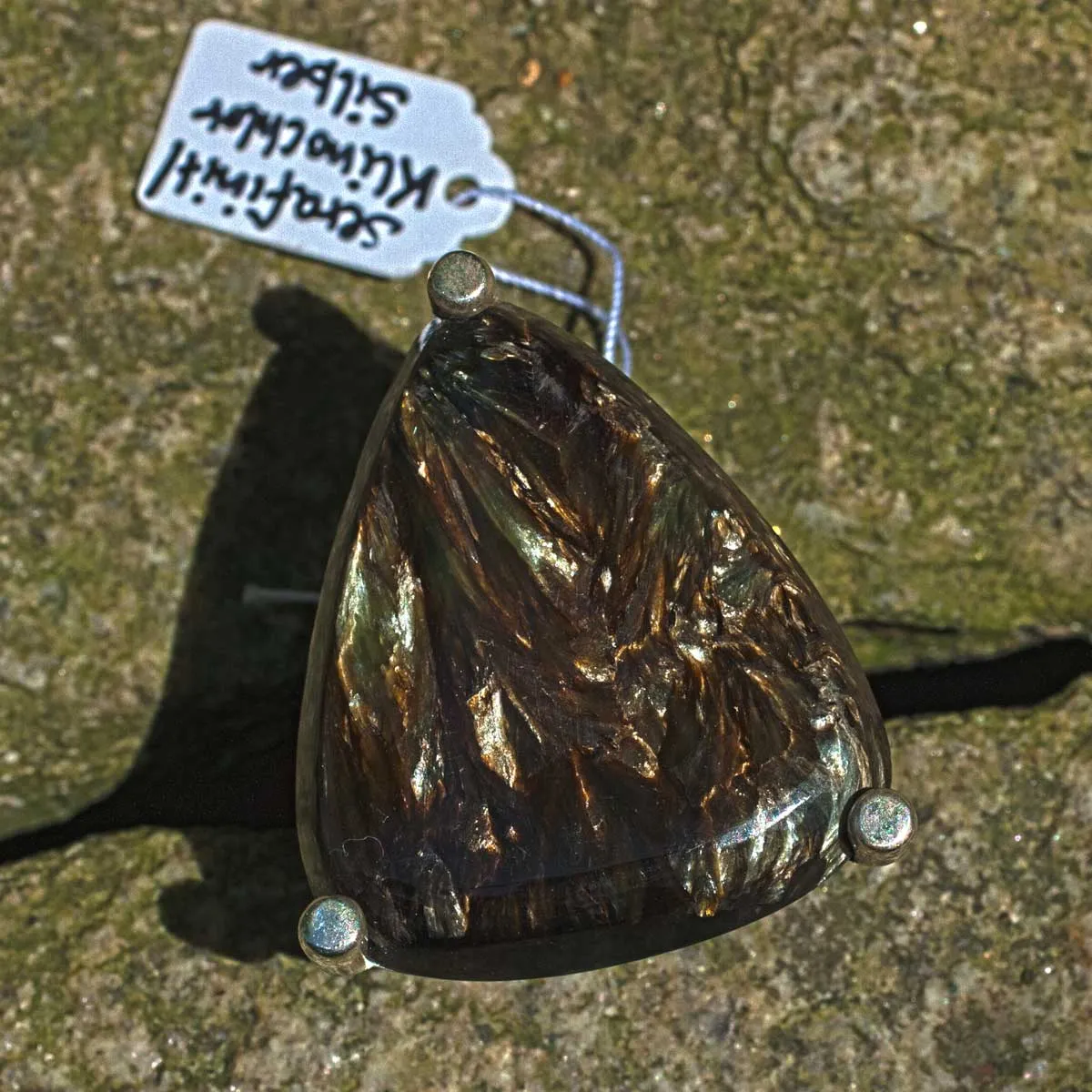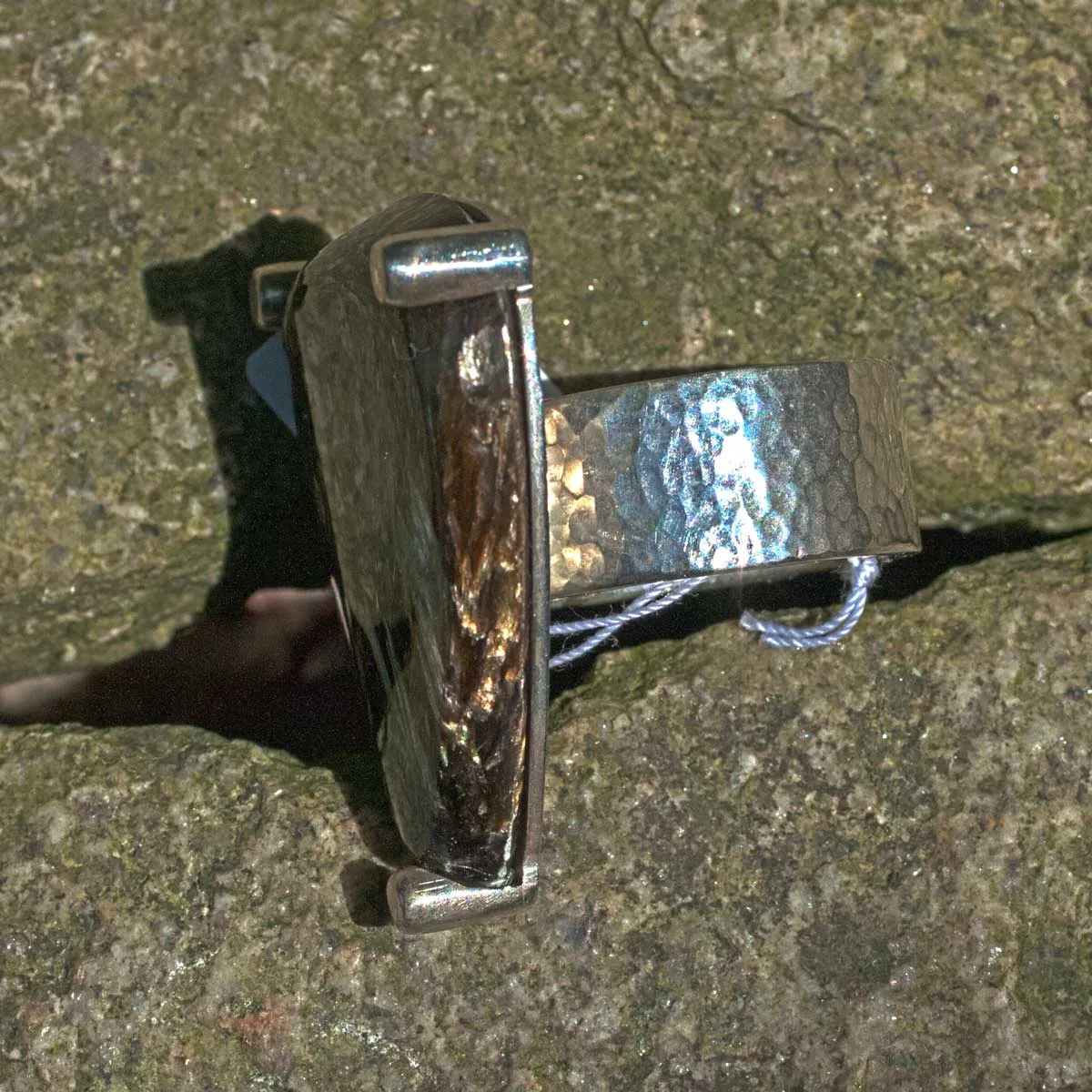 Ring dreieckiger Serafinit gehalten von drei massiven Silberkrappen auf 10mm breiter Silberschiene mit Hammerschlagoberfläche – Ring mit Stein