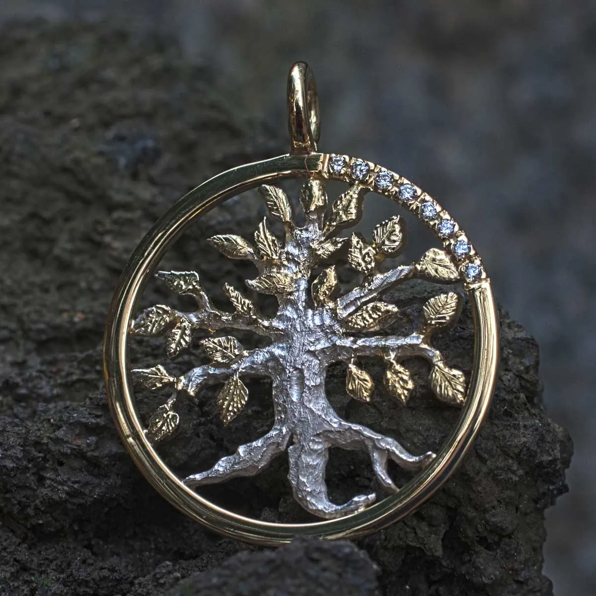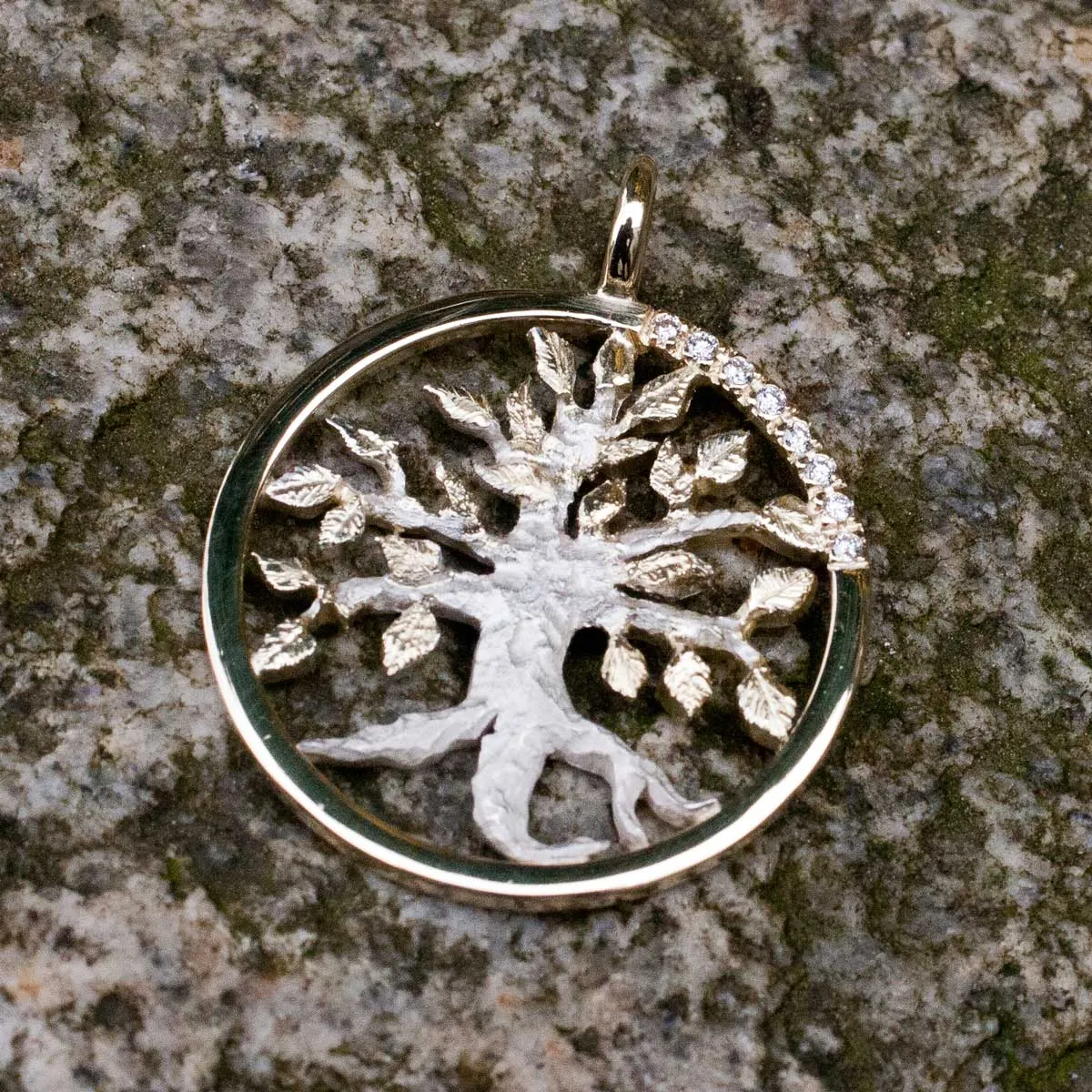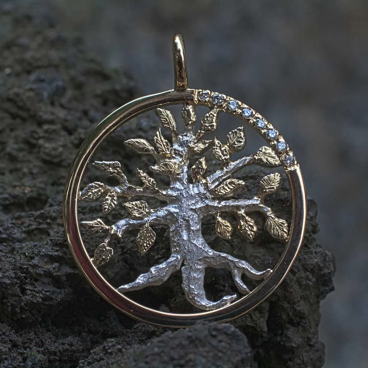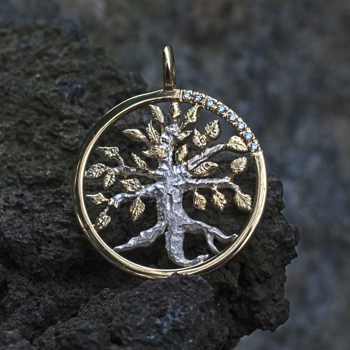 silberner Lebensbaum mit goldenen Blättern in goldenem Ring mit acht Brillanten in Pavee-Fassung
