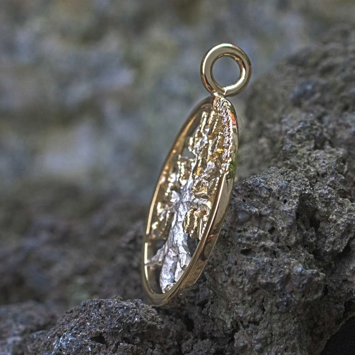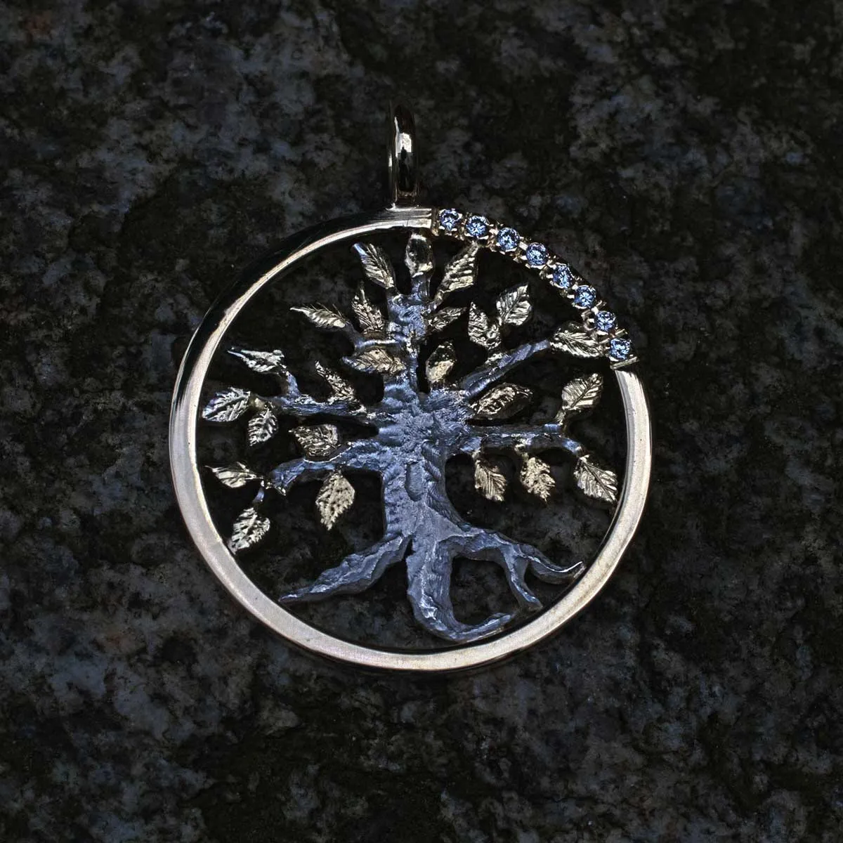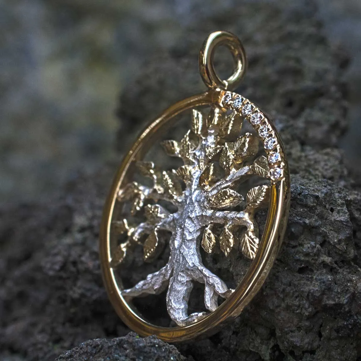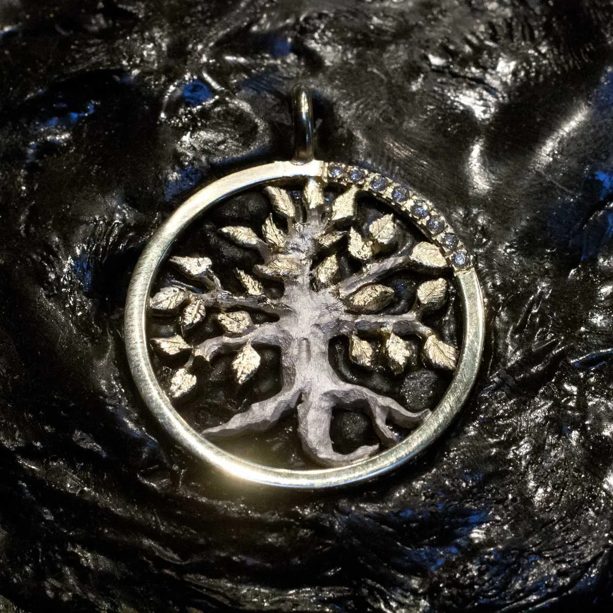 silberner Lebensbaum mit goldenen Blättern in goldenem Ring mit acht Brillanten in Pavee-Fassung