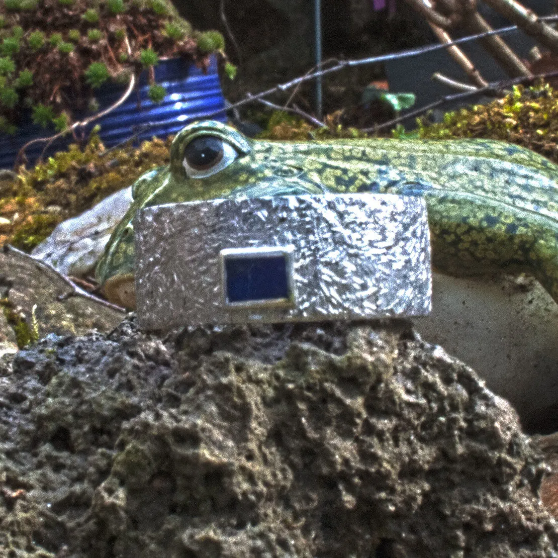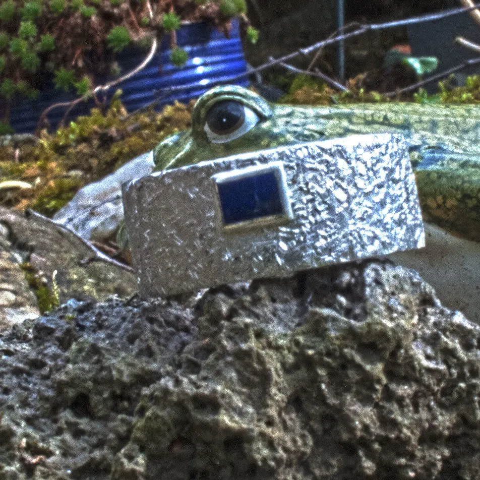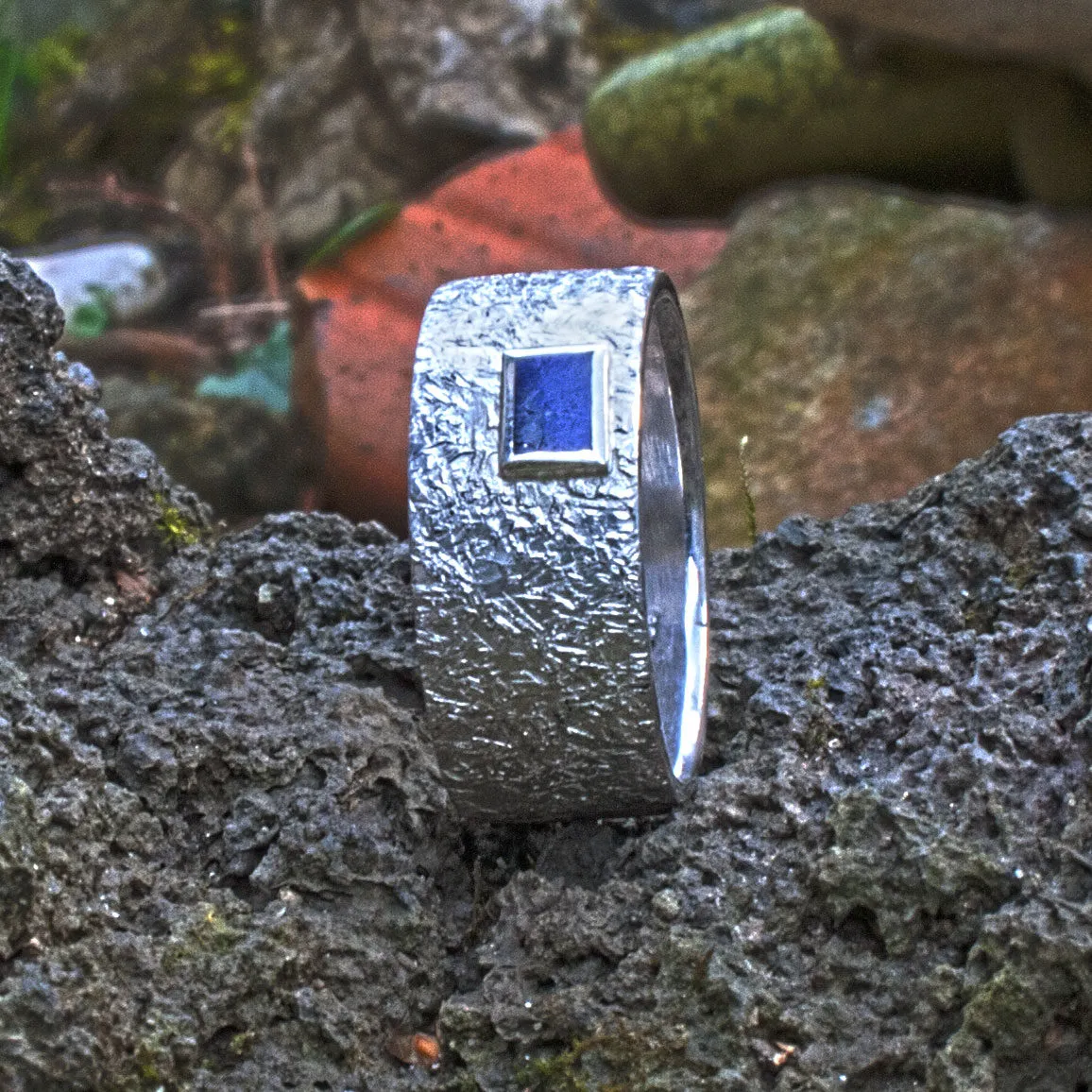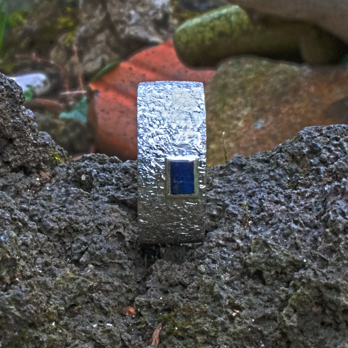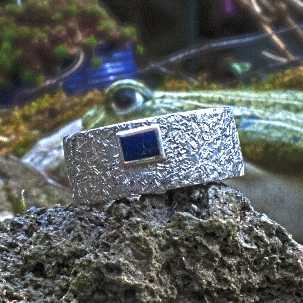 Silberring mit Hammerschlag-Struktur mit aufgesetztem rechteckigen Lapislazuli in Zargenfassung