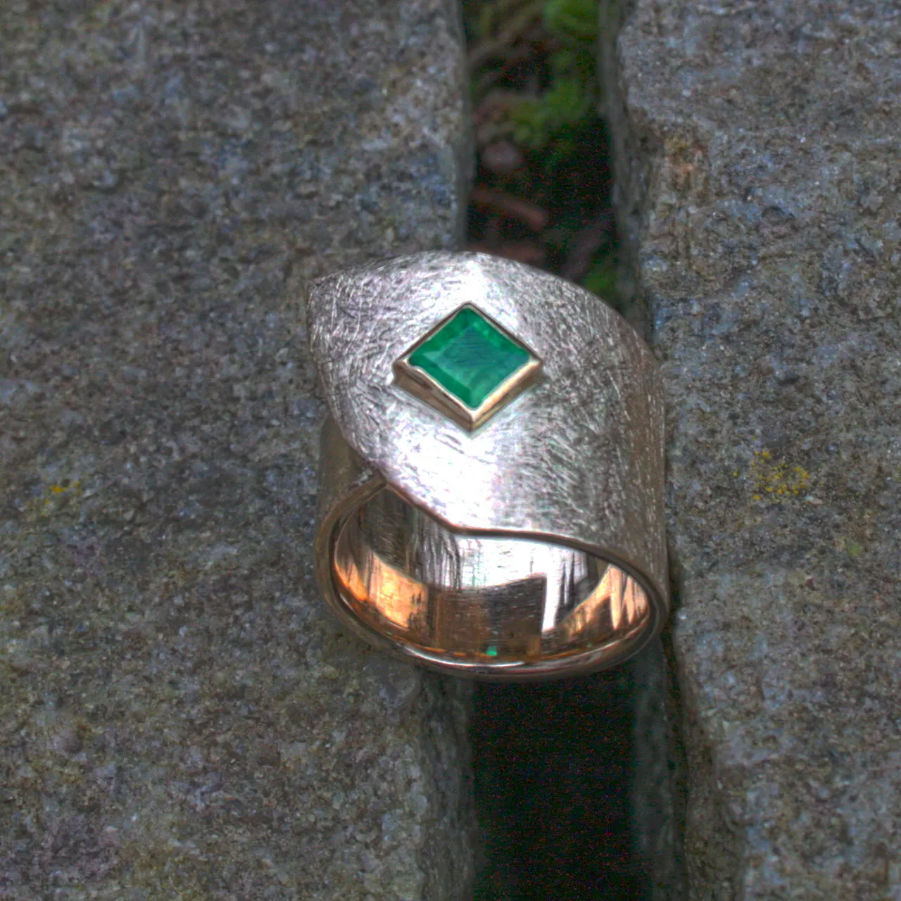 Wickelring aus Gelbgold mit aufgesetzem Smaragd Carree facettiert , in Zargenfassung