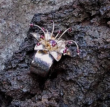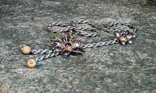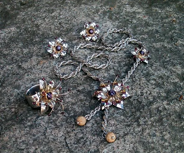 Collier Silber mit blütenförmigen Wechselschließen mit Goldbesatz, Sternrubin und Granatkügelchen,