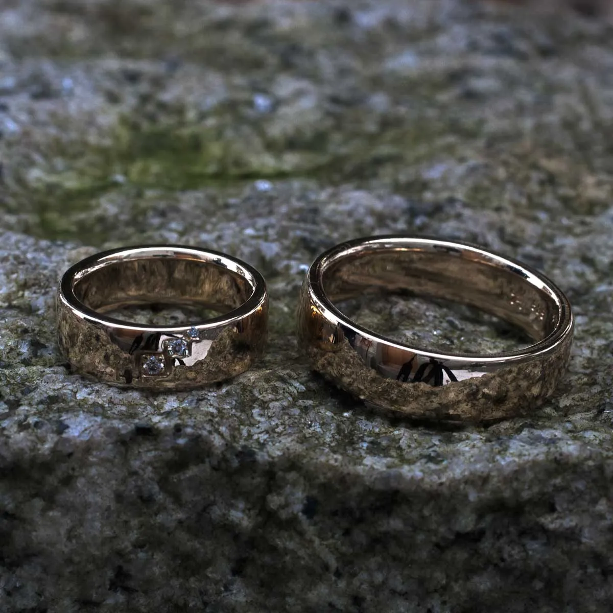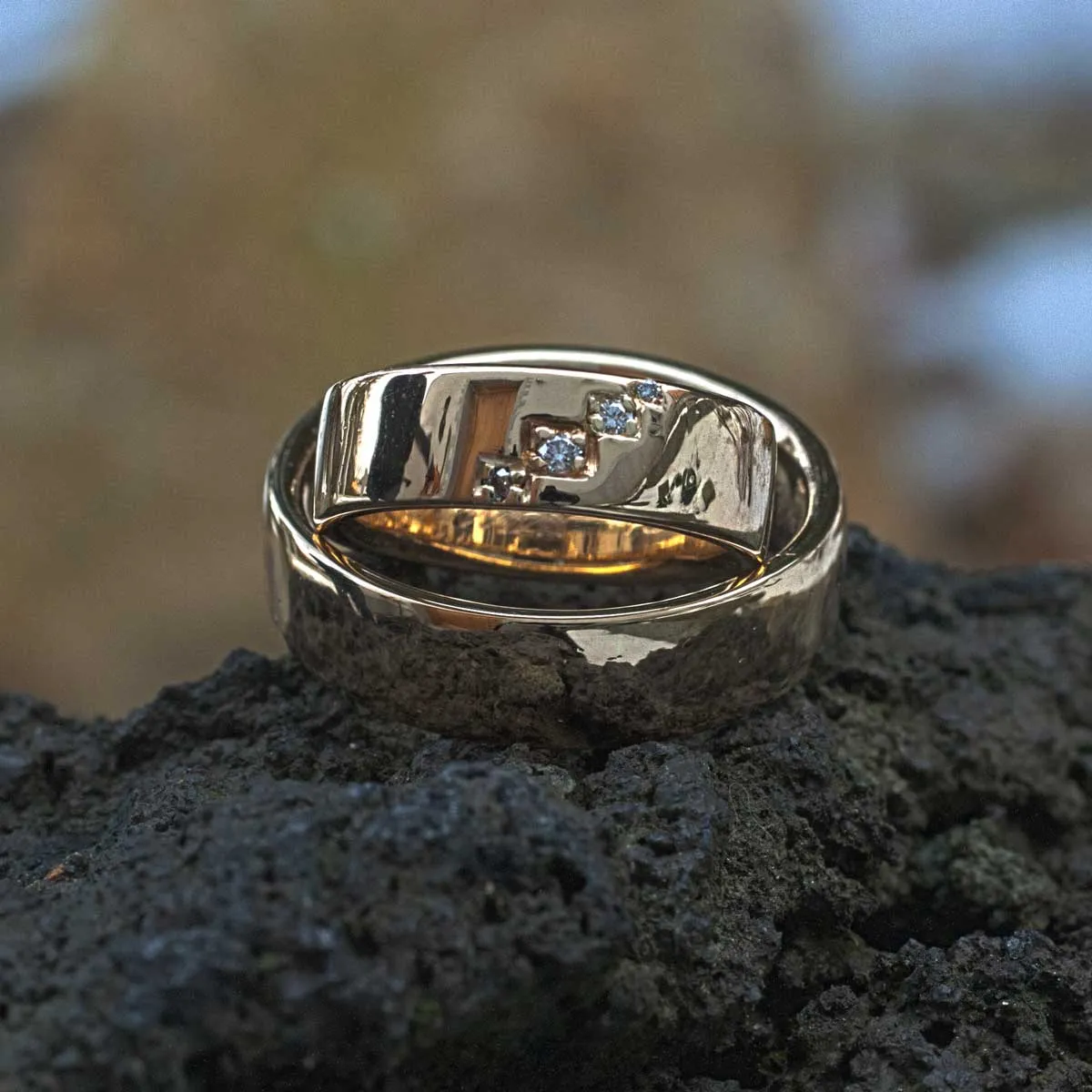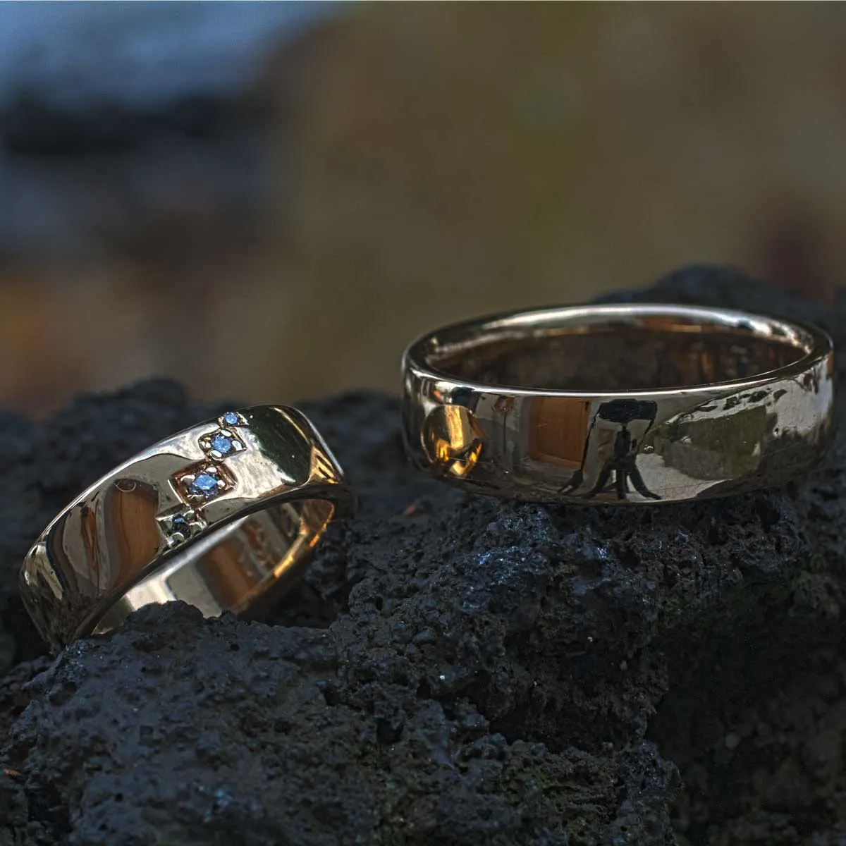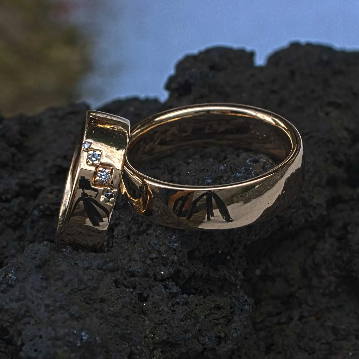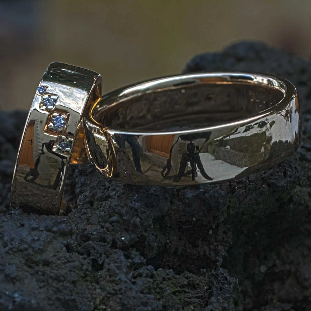 gelbgoldene Trauringe mit vier Brillanten in Pavéefassung schräg über den Ring verlaufend