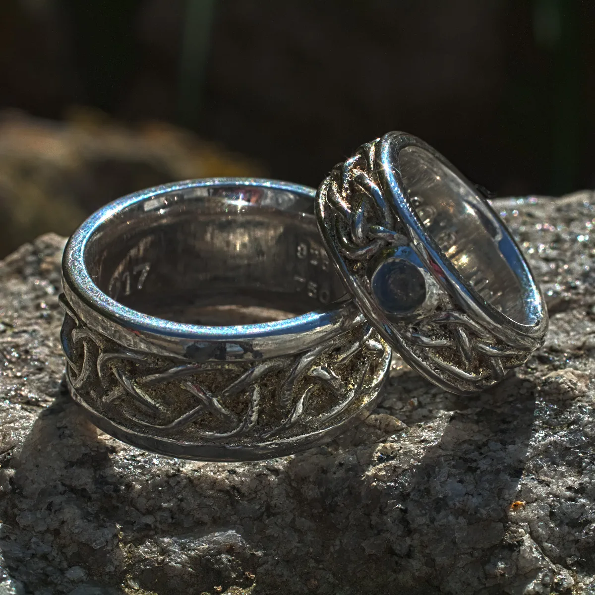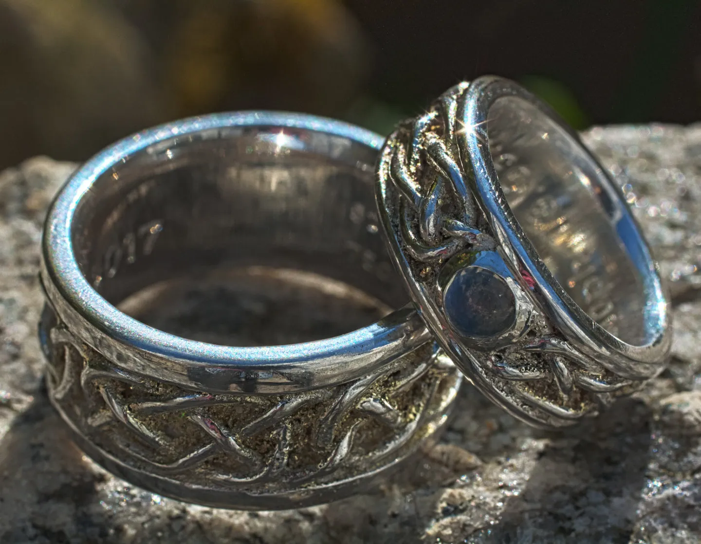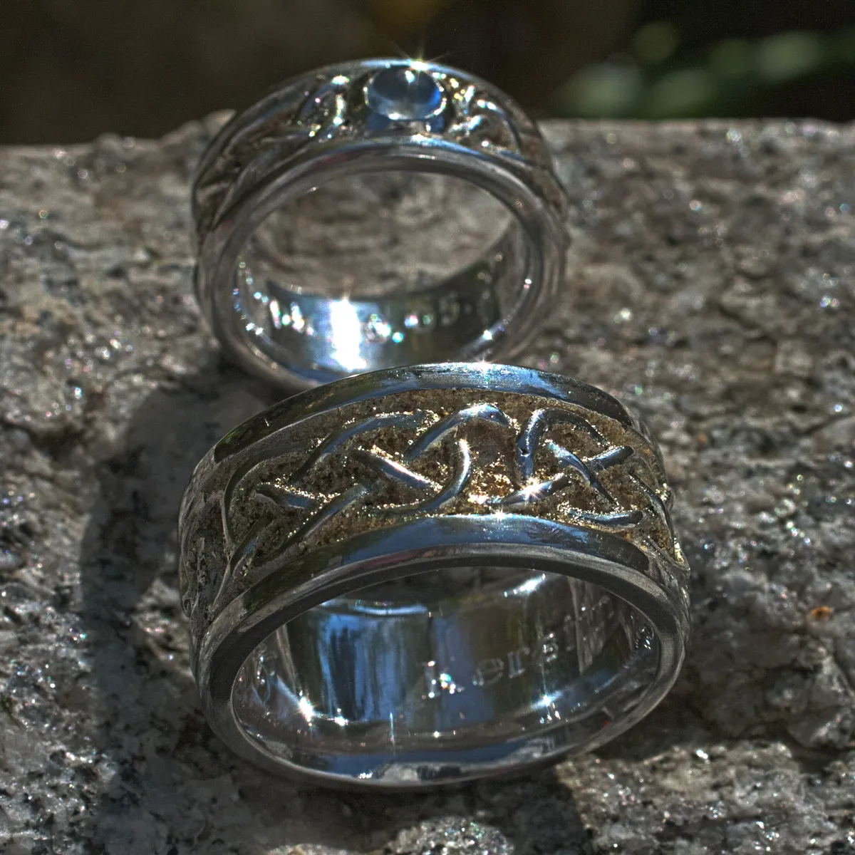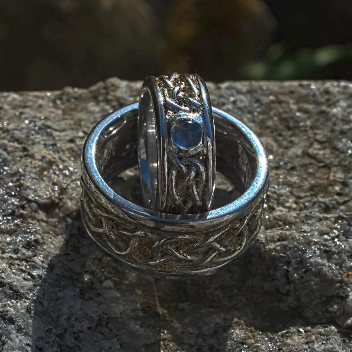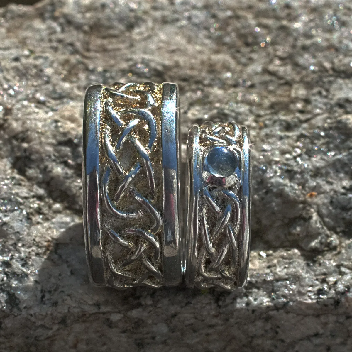 Trauringe Silber mit keltischem Flechtband liegende Acht mit Gelbgoldstaub in den Zwischenräumen, Damenring mit Regenbogenmondstein Cabouchon