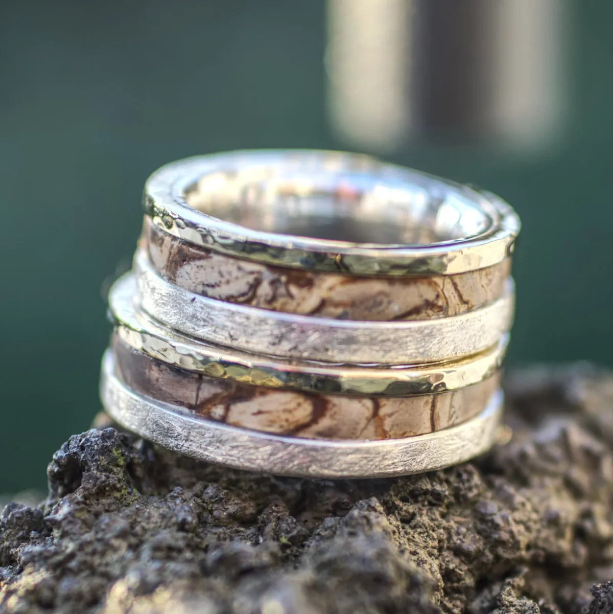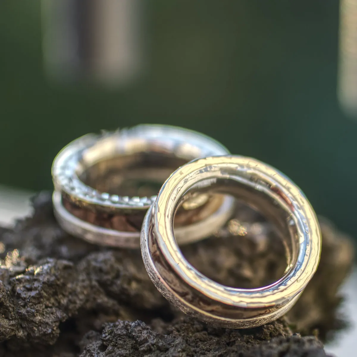 Eheringe Silber mit versteinertem Holz aus Madagaskar und aufgesetztem Ring aus Gelbgold