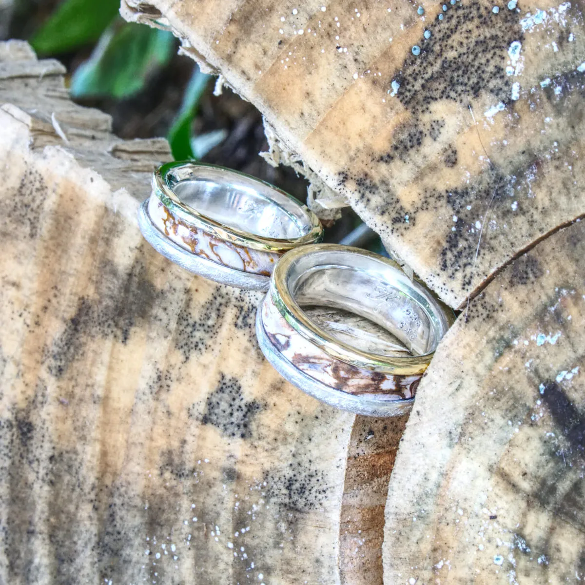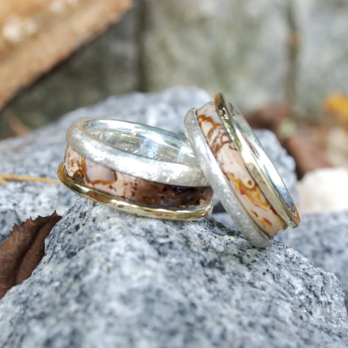 -Silber 925/°°° -Gelbgold 585/°°° -versteinertes Holz aus Madagaskar Eheringe Silber mit versteinertem Palmholz aus Madagaskar und aufgesetztem Ring aus Gelbgold Eheringe Trauringe