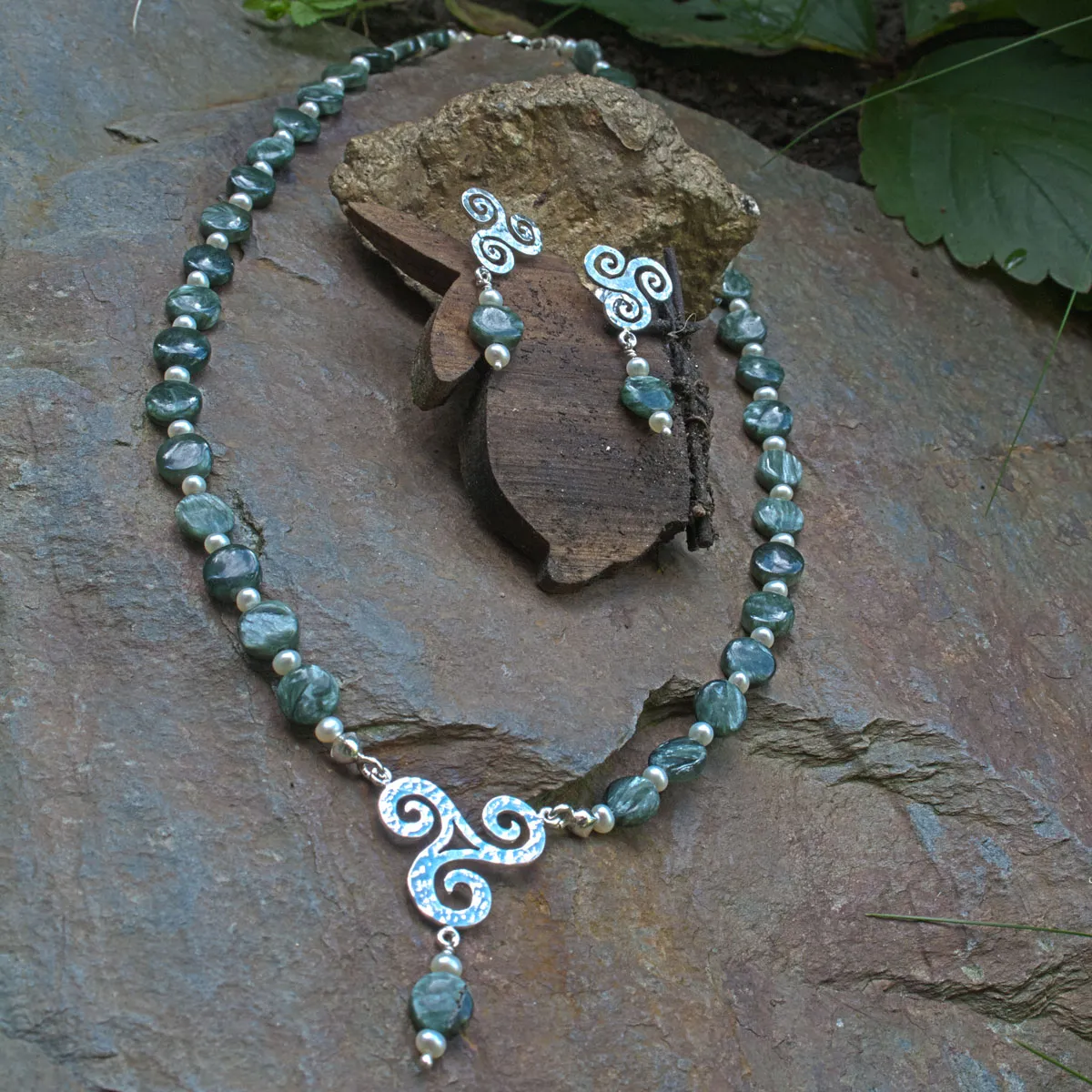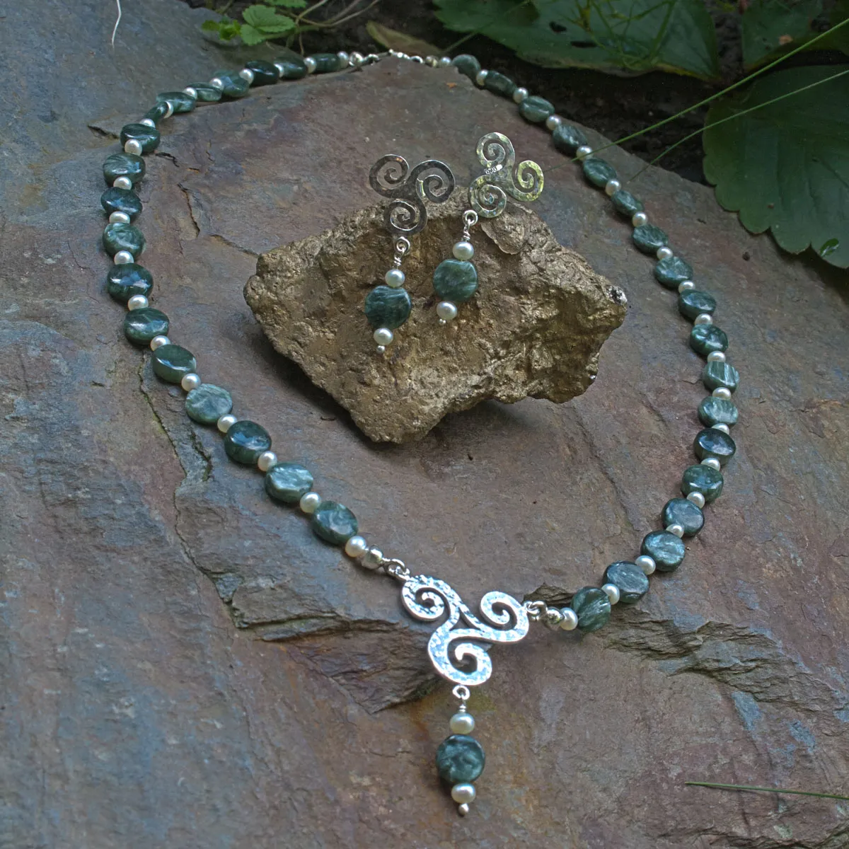 Collier aus Serpentin-Linsen und Süßwasserzuchtperlen mit Mittelteil Triscell in Silber,