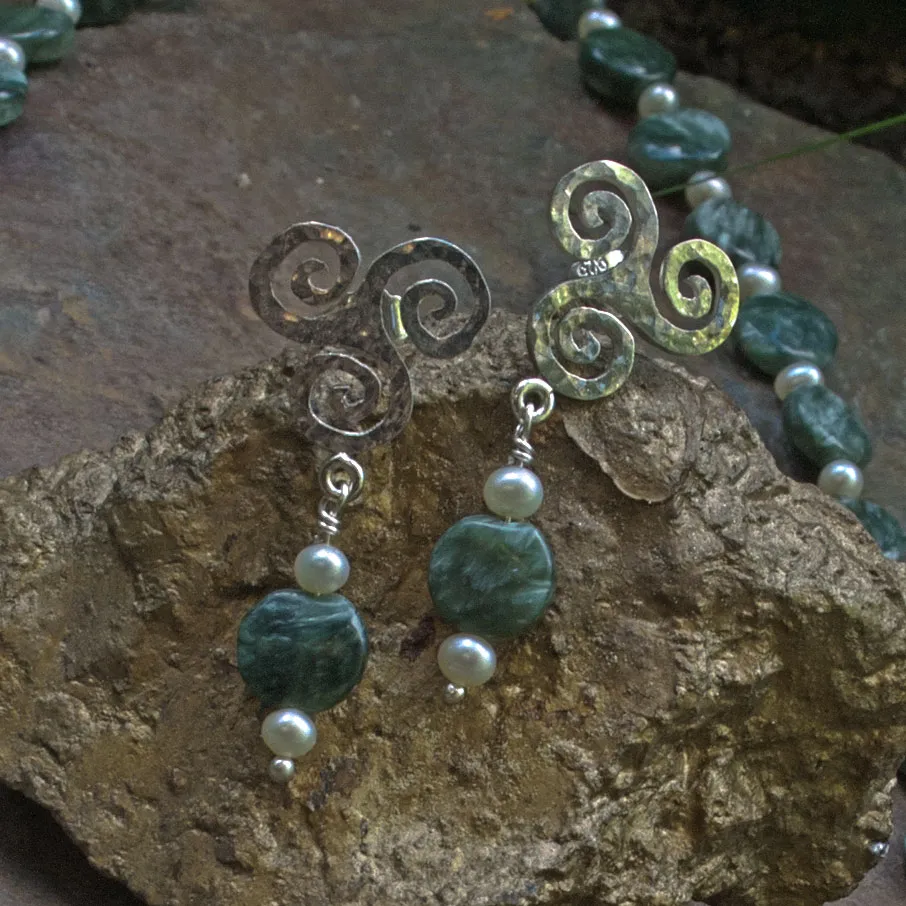Silberohrstecker Wotansknoten mit Serpentin-Linse und Süßwasserzuchtperlen