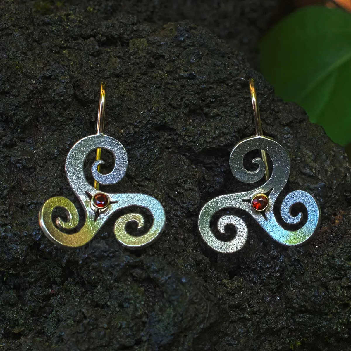 Ohrringe Triskele zweifarbig Silber und Gold mit Granat