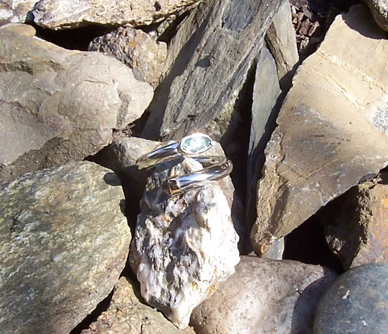 Silberring offen mit Indigolith-Cabouchon und Rubelith-Cabouchon in Gelbgoldfassung an den Enden