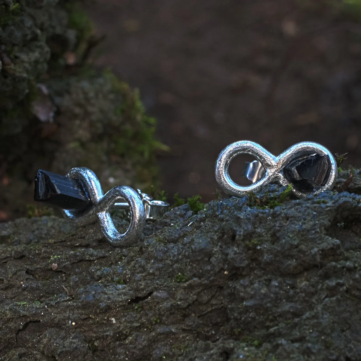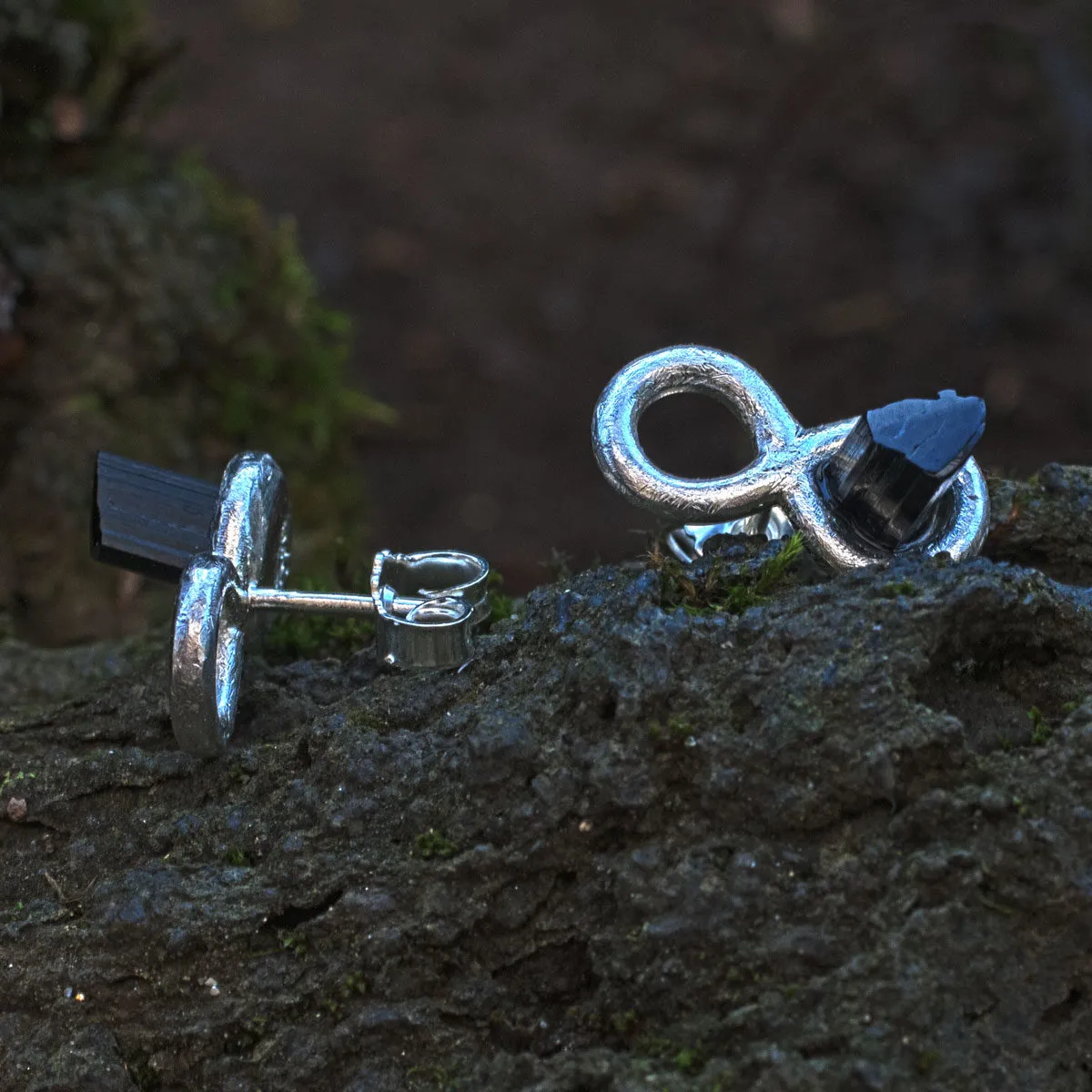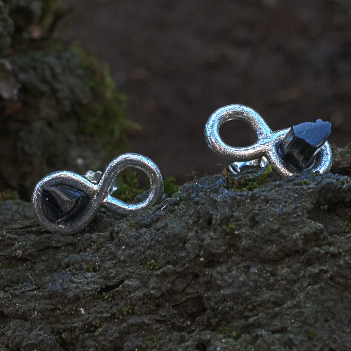 Silber-Ohrstecker in Form einer liegenden Acht mit schwarzem Turmalin-Kristall