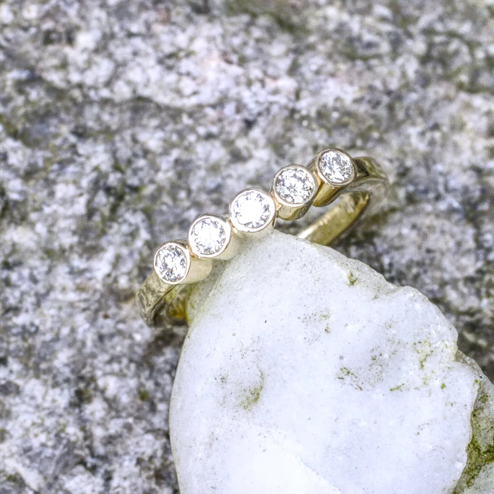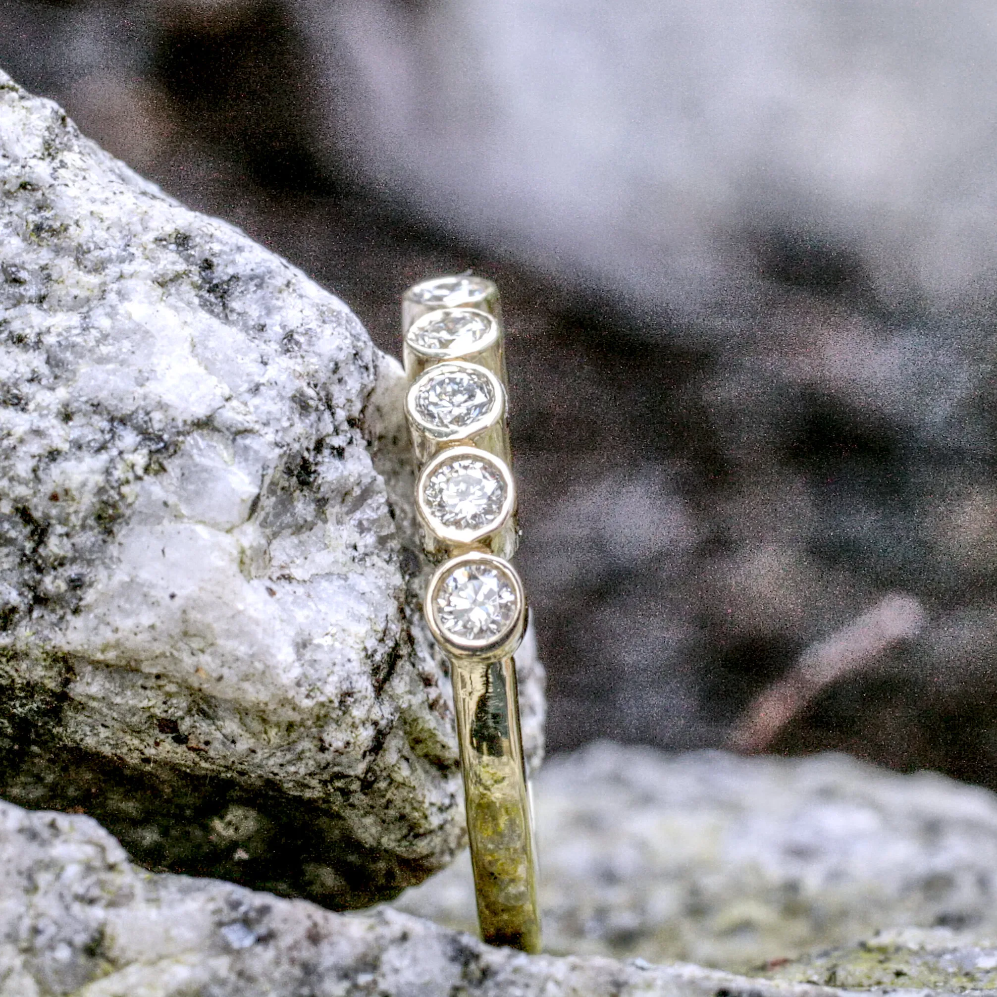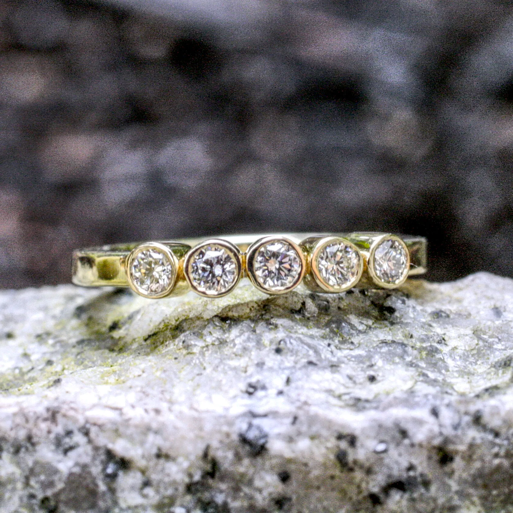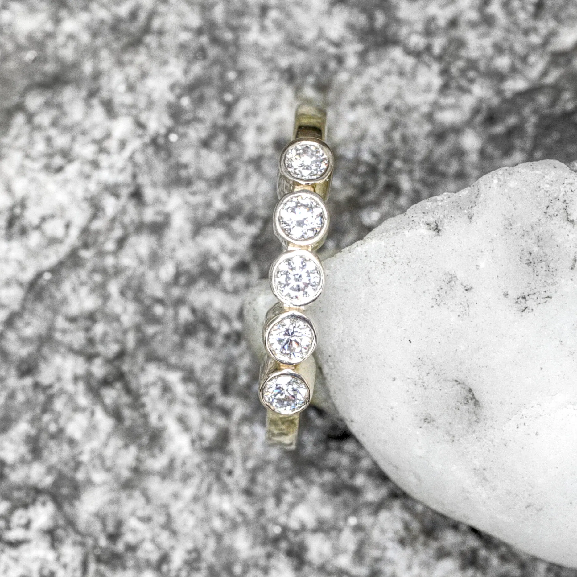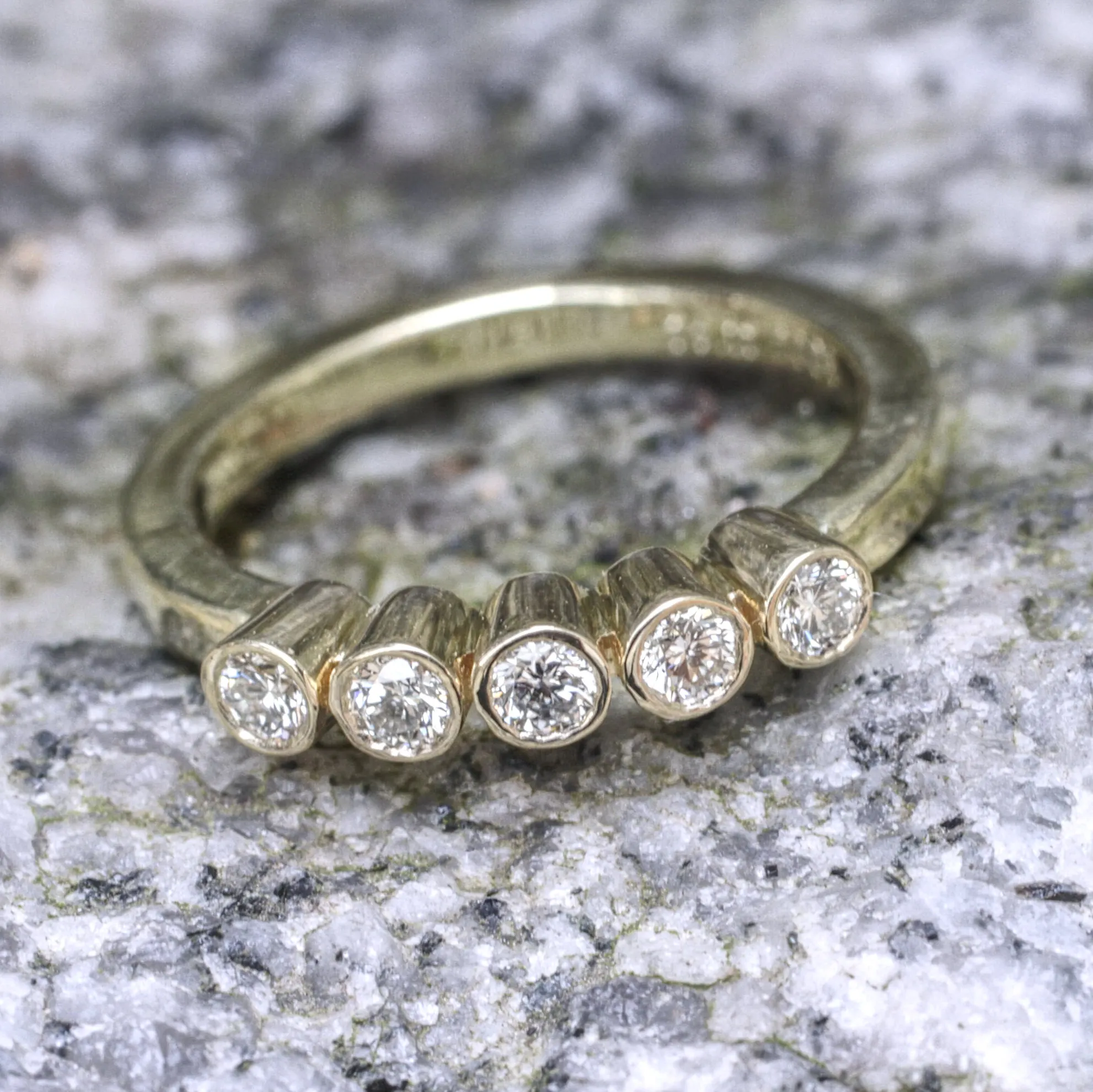 Bandring 585/°°° Gelbgold mit fünf konischen Zargenfassungen mit Brillanten