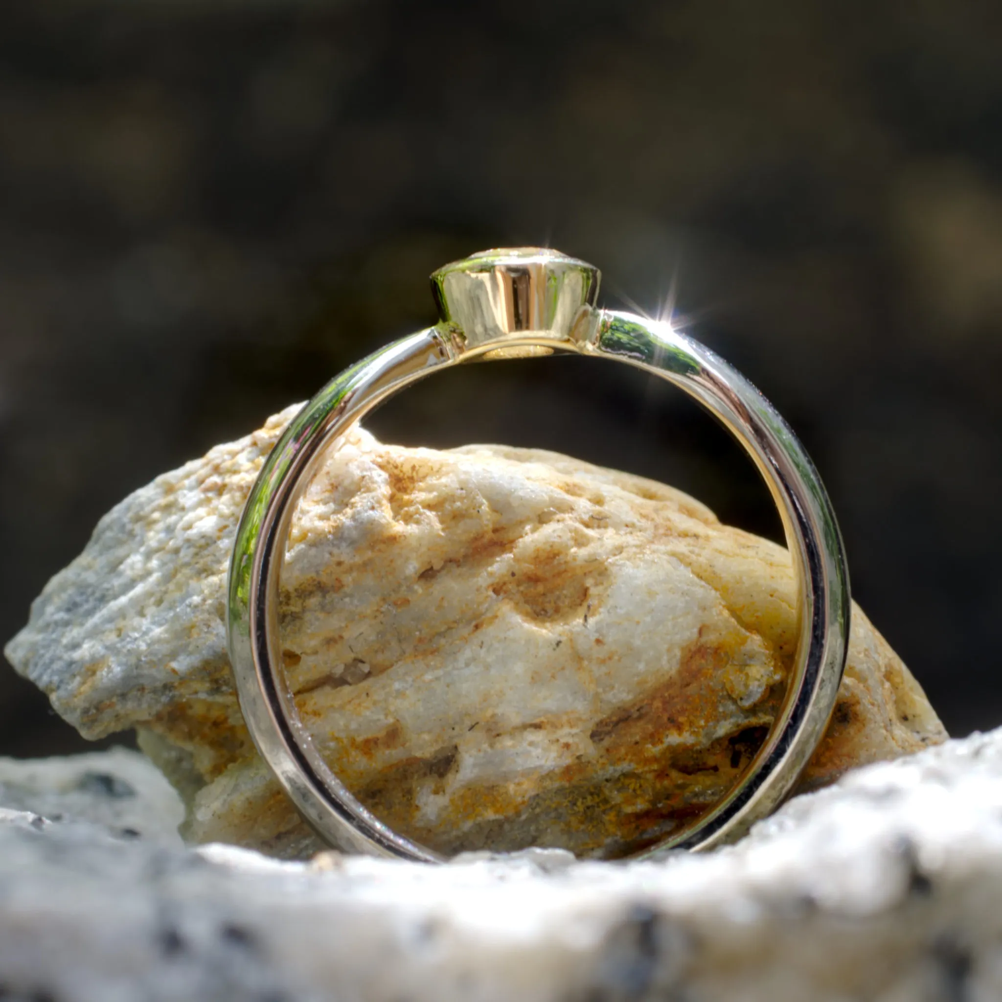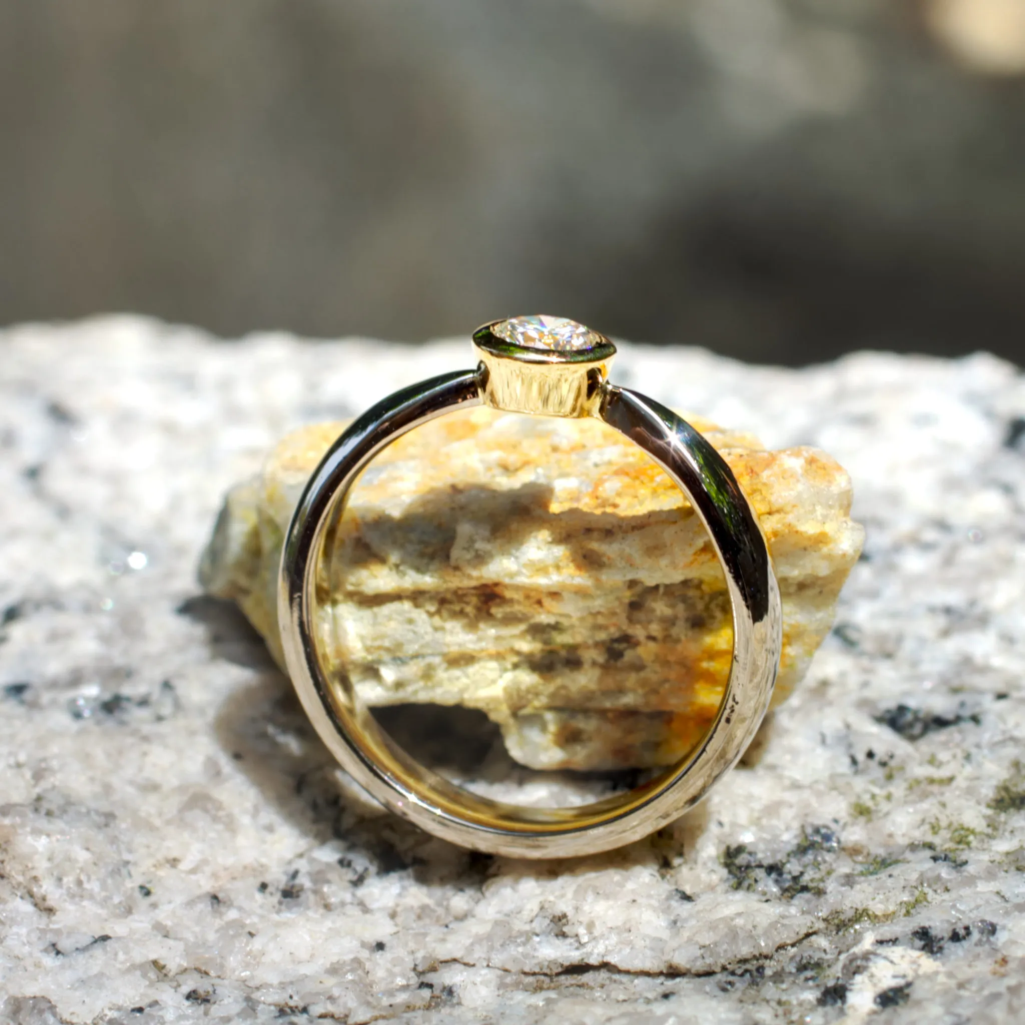 Brillant in konischer Gelbgold-Fassung in zur Fassung spitz zulaufender Weißgoldschiene