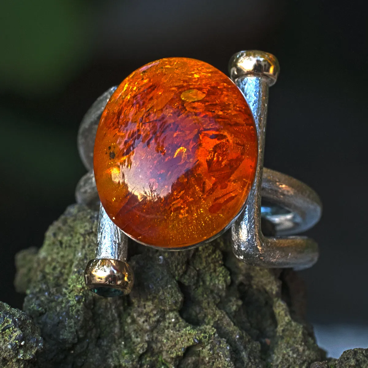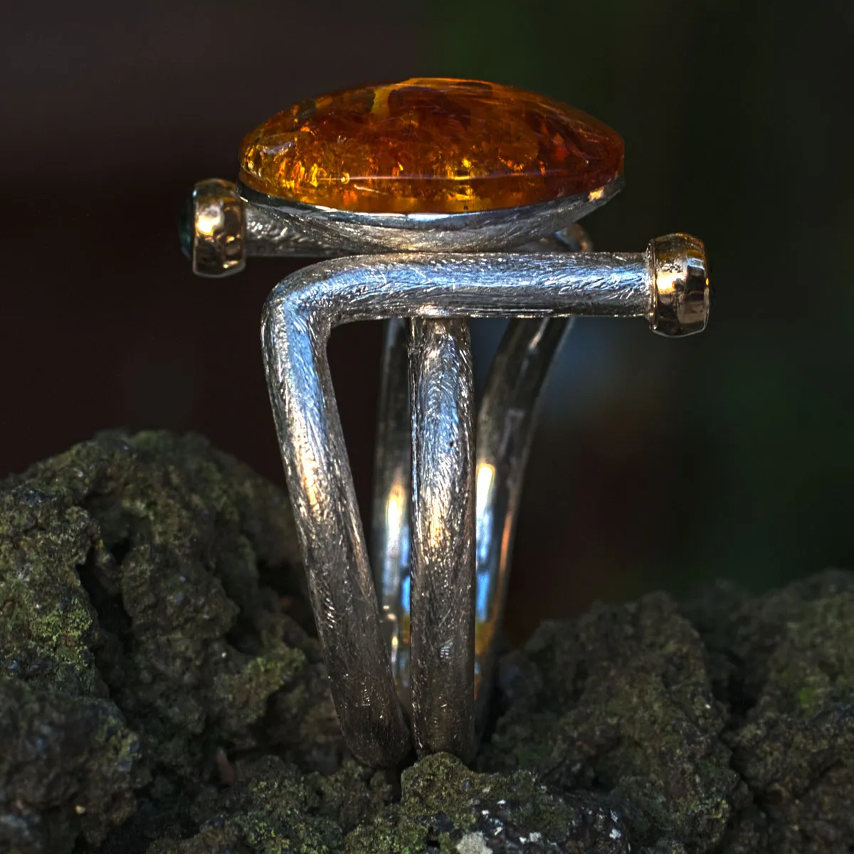 gewickelter Ring aus Silberrunddraht mit Bernsteincabouchon und zwei blaugrünen Turmalinen