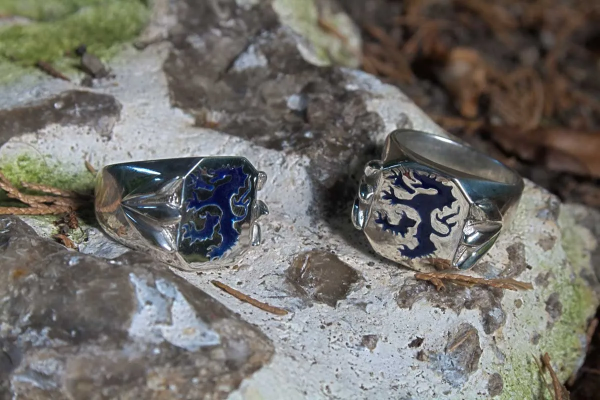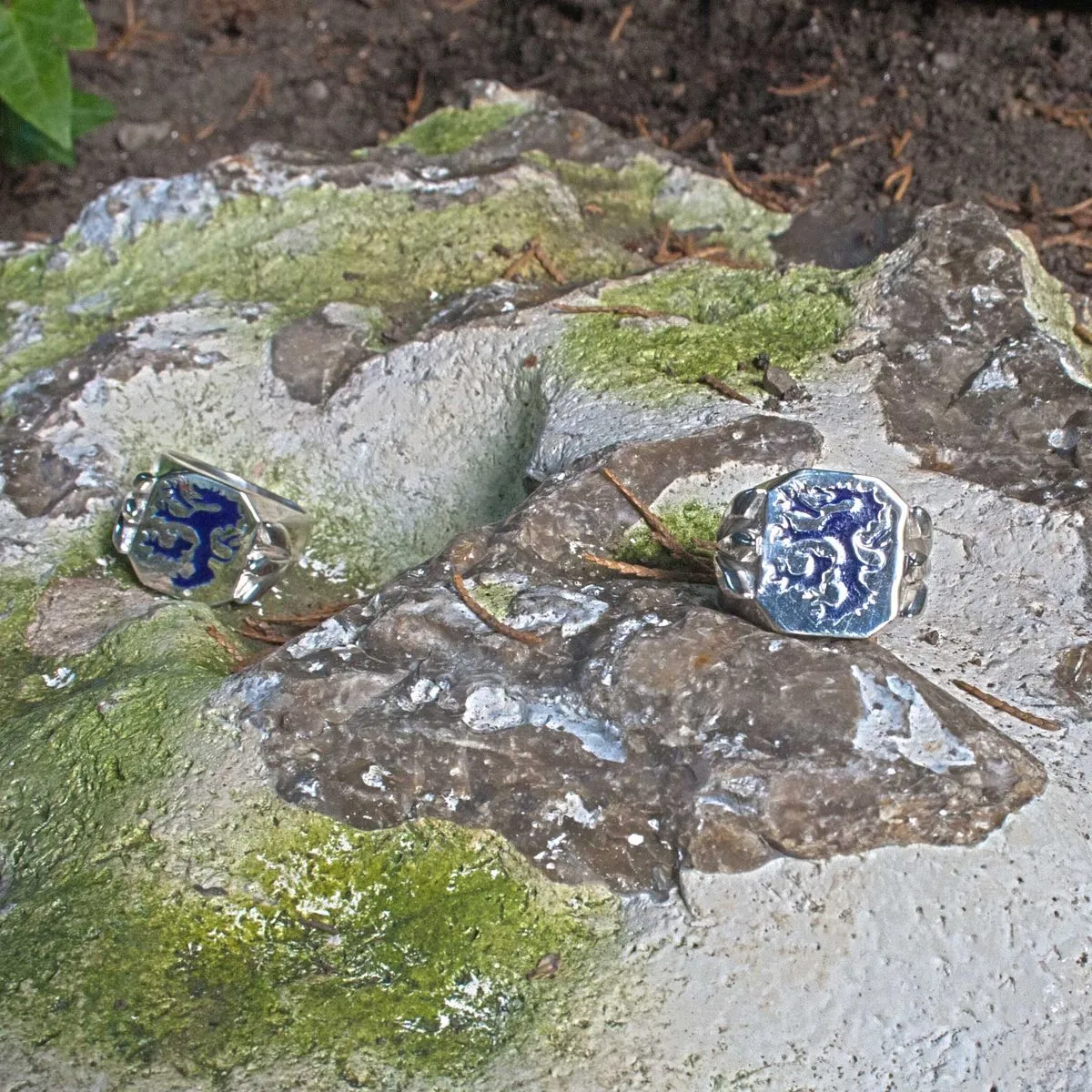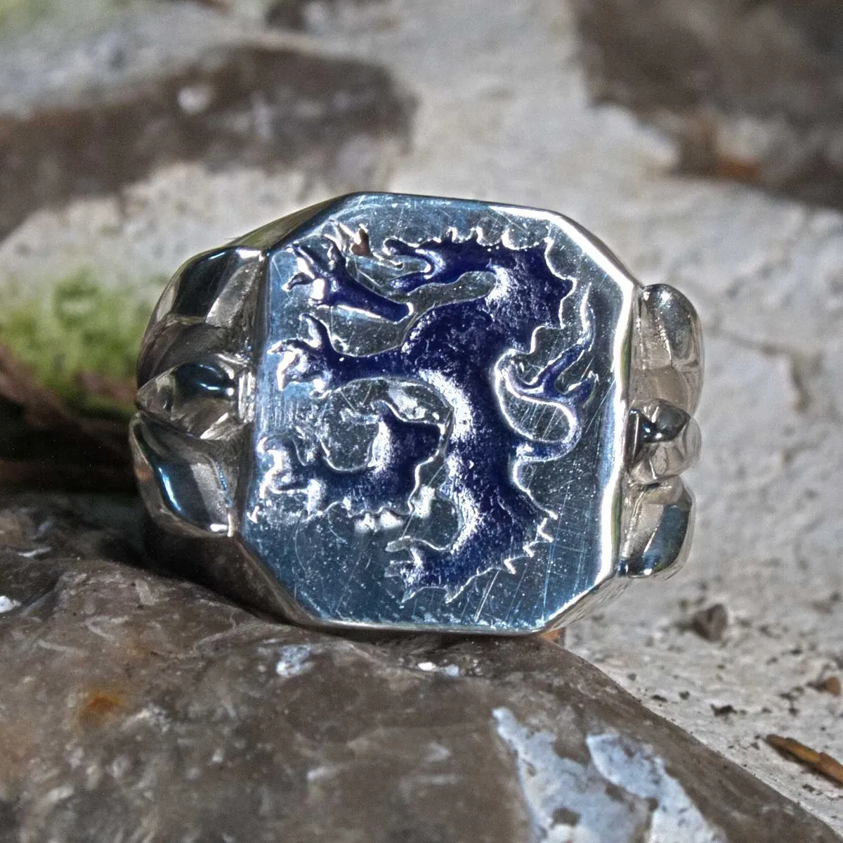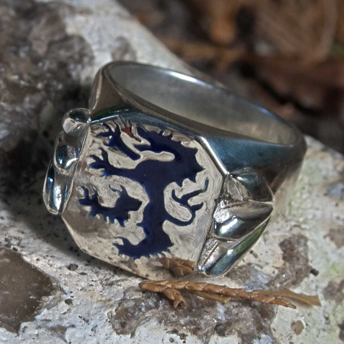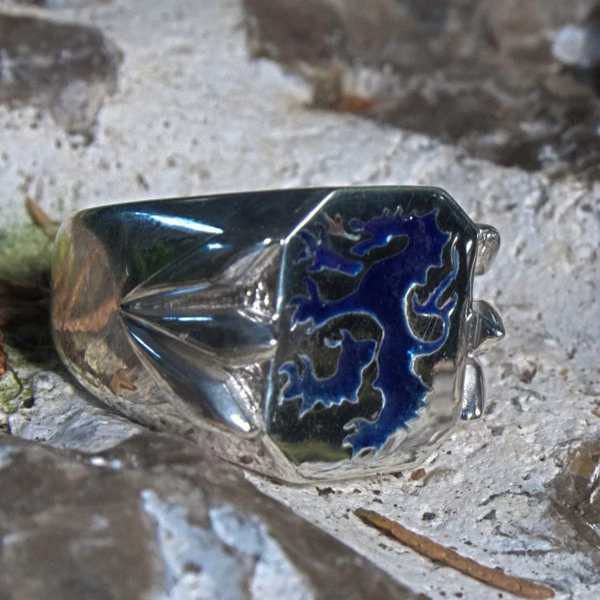 Silberring mit ausgesägtem niederbayrischen Panther mit Emailleeinlage blau und rot
