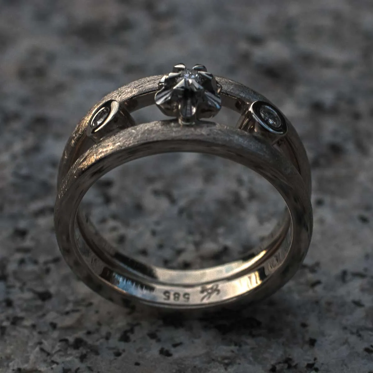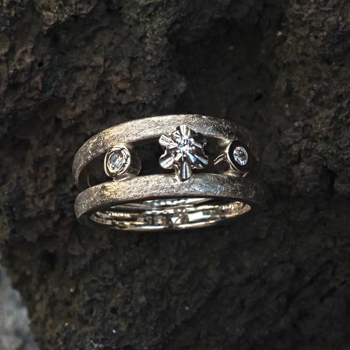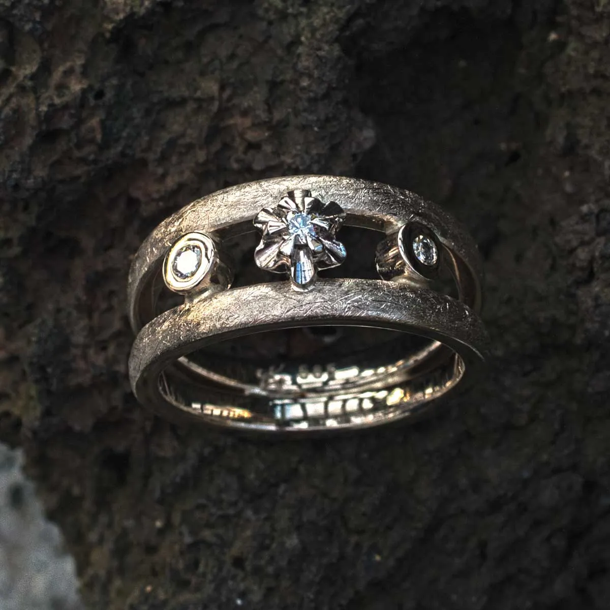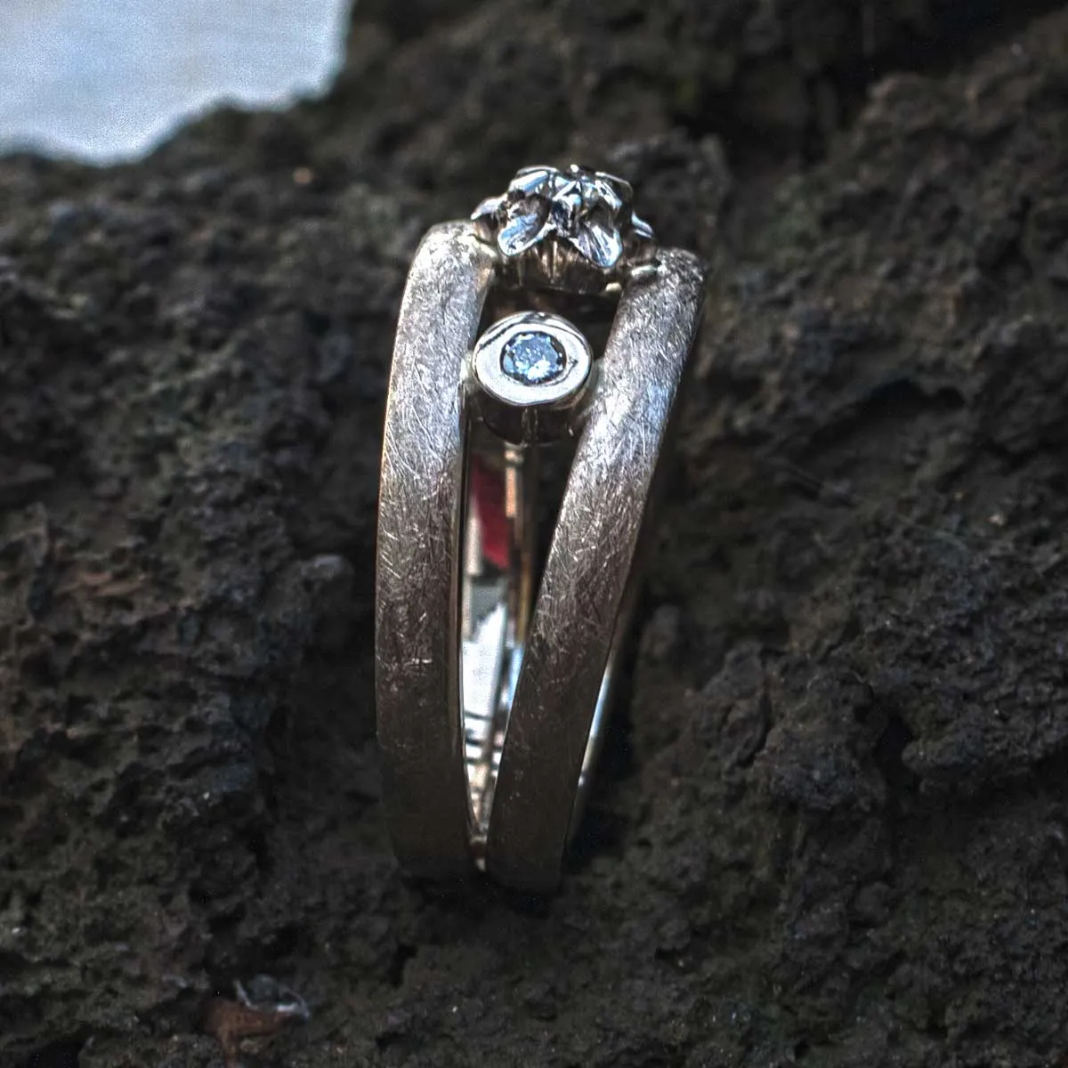 Weißgoldring zusammengesetzt aus zwei schmalen Weißgoldringen mit Blume mit Brillant und zwei Brillanten in Zargenfassung