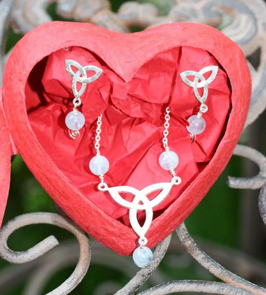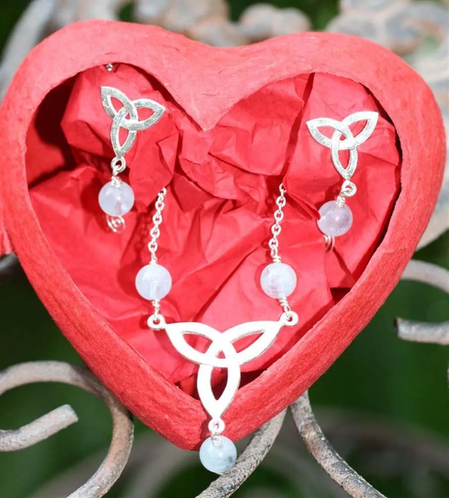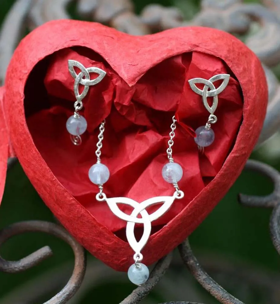 Silberkette mit Wotansknoten und drei Aquamarin-Kugeln, Ohrstecker Wotansknoten Silber mit einer Aquamarinkugel