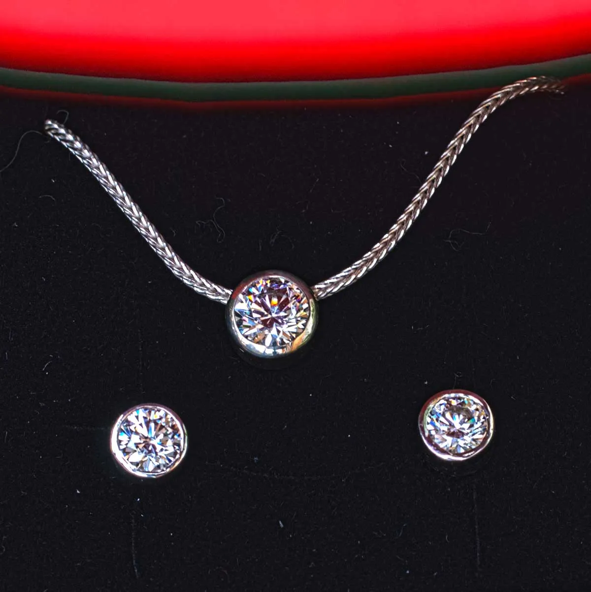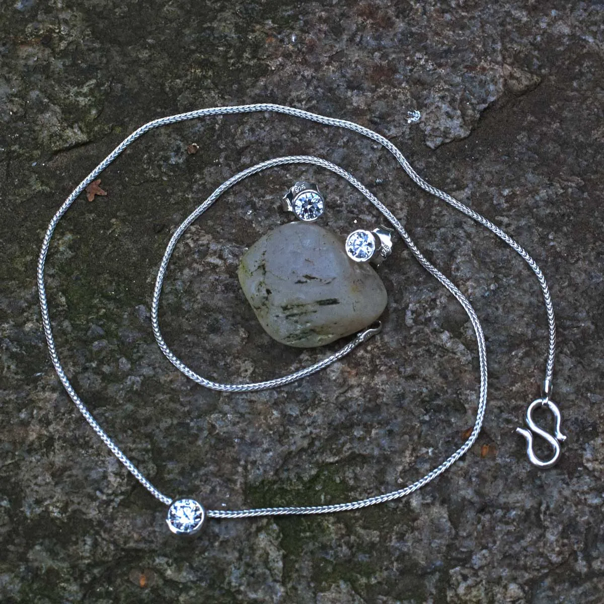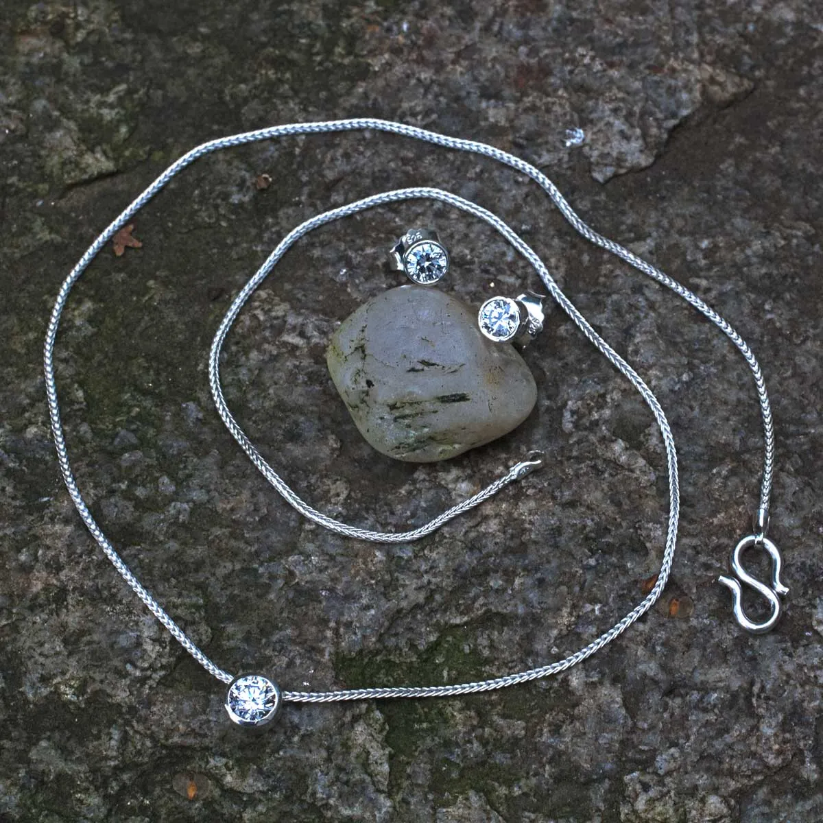 Zirkonia in Zargenfassung als Ohrstecker und Anhänger auf der Fuchsschwanzkette laufend