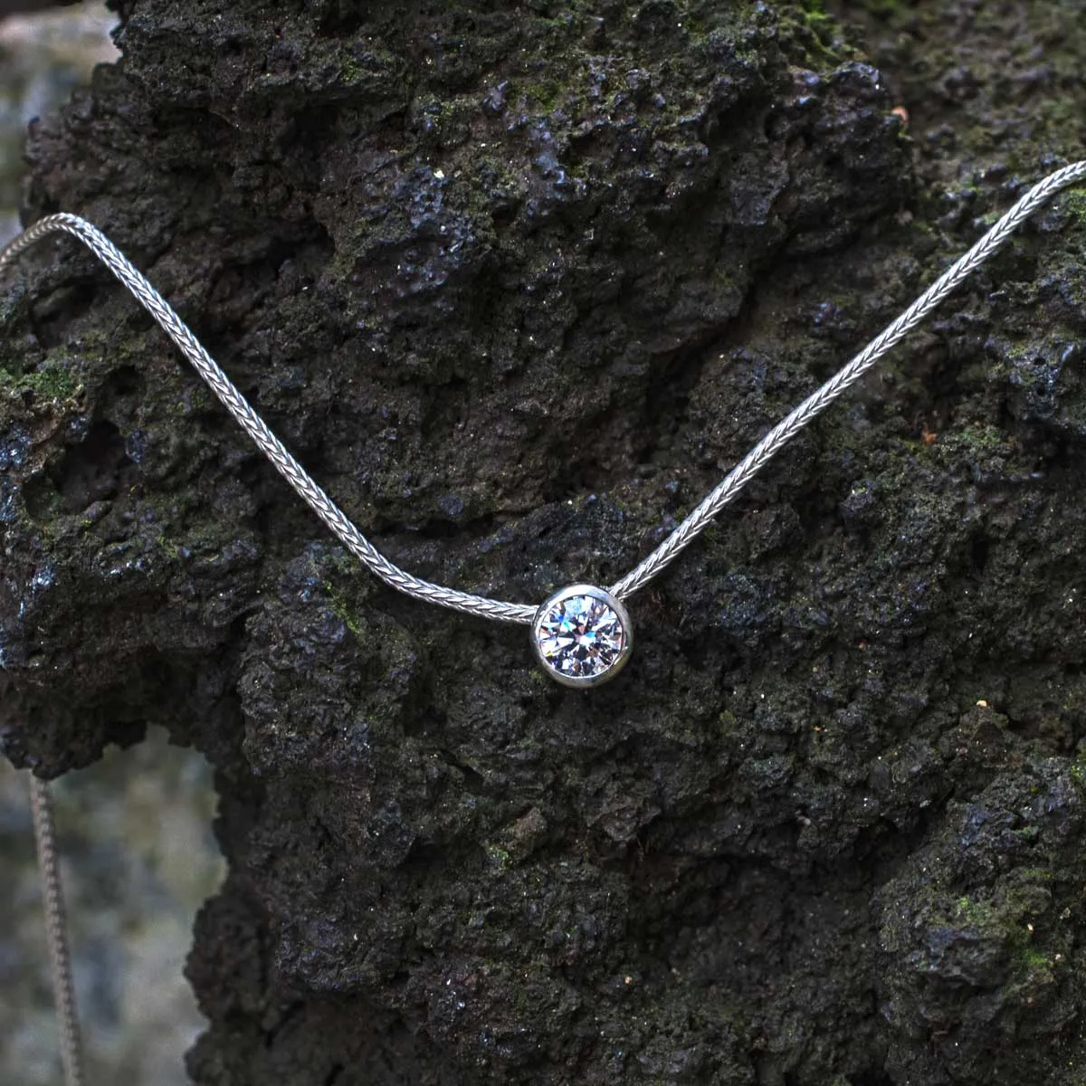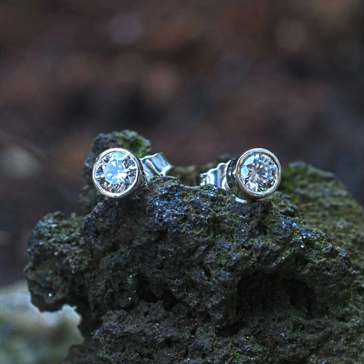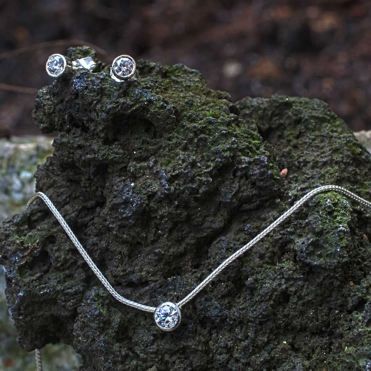 Zirkonia in Zargenfassung als Ohrstecker und Anhänger auf der Fuchsschwanzkette laufend