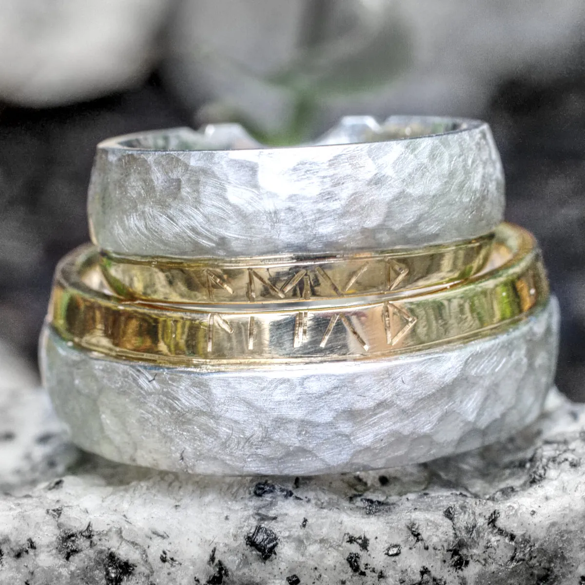 Rückseitig sind Runen im Goldrand graviert, die nur bei den zusammengesetzten Ringen zu lesen sind